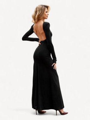 De Veloria-jurk accentueert je taille met subtiele plooien en straalt pure elegantie uit. Met een diep open rug, lange mouwen en een stijlvolle split combineert ze sensualiteit met moderne klasse. Schoudervullingen zorgen voor een sterke, vrouwelijke vorm. Perfect voor gala’s en avondfeesten.