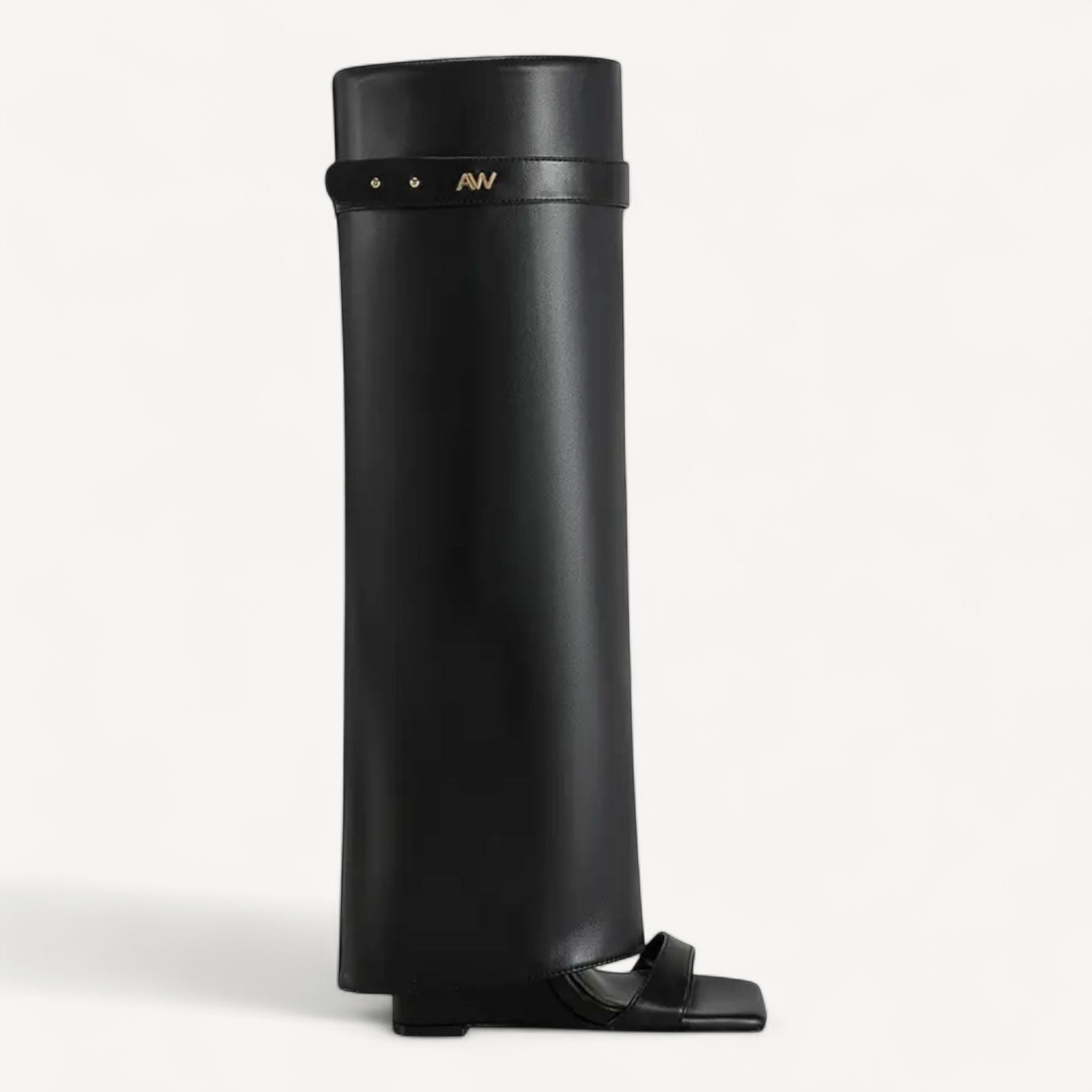Uniek en gedurfd. Deze zwarte onderknee laarzen met open teen en een elegante sleehak van 10 cm combineren comfort met een opvallend design. Perfect om jouw look nét dat edgy fashion-statement te geven.