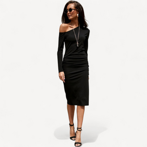 De Noemi midi-jurk met one-shoulder halslijn en subtiele plooien accentueert je silhouet terwijl de elastische stof comfort biedt. Perfect voor elegante recepties, romantische diners of een avondje uit.