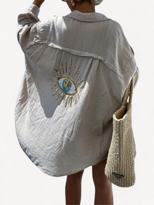 Speels, stijlvol en subtiel glamoureus. Deze dress/blouse valt op door het glitteroog-detail aan de achterkant en zorgt voor een elegante touch, zowel op het strand als tijdens een avondje uit. Licht, comfortabel en onweerstaanbaar fashionable.