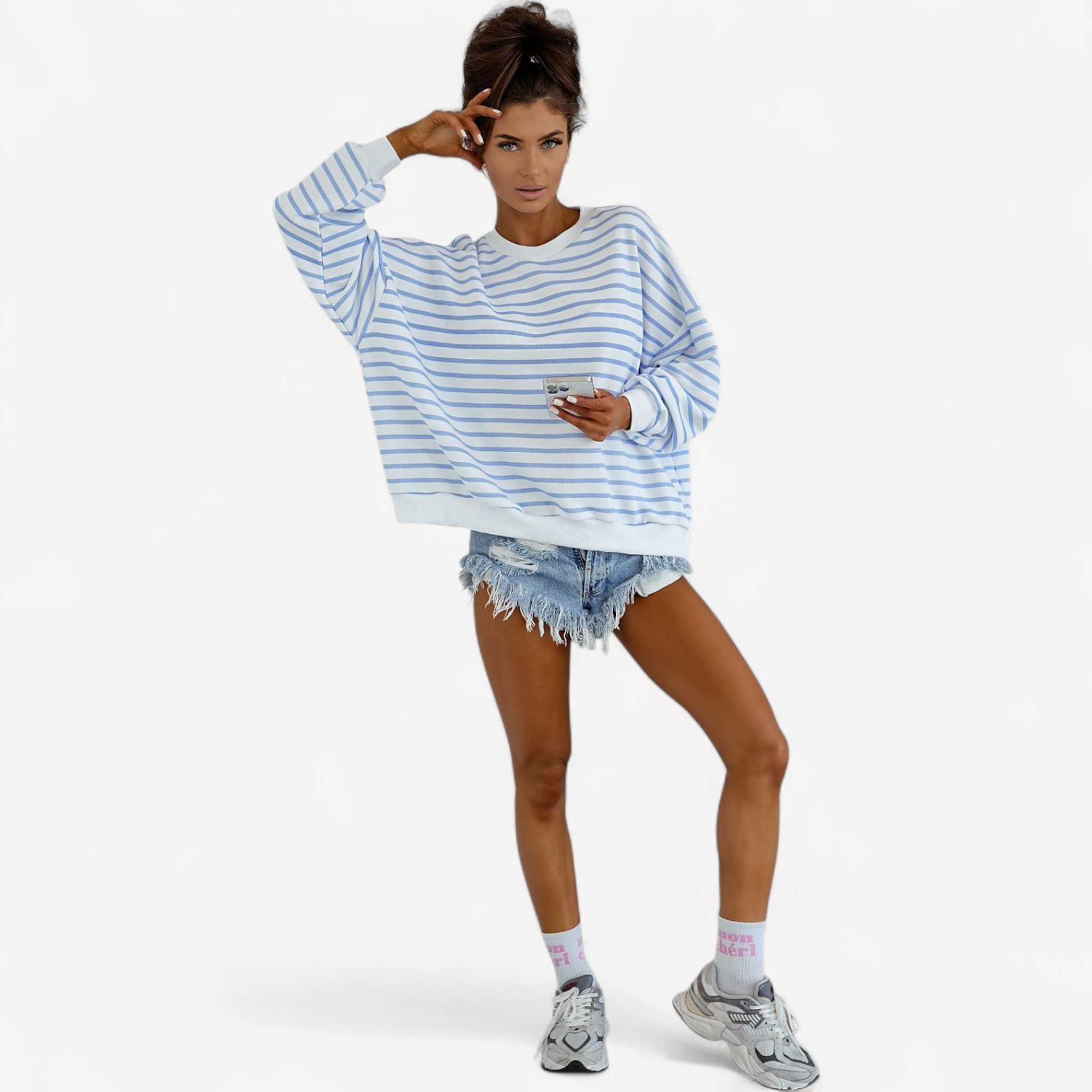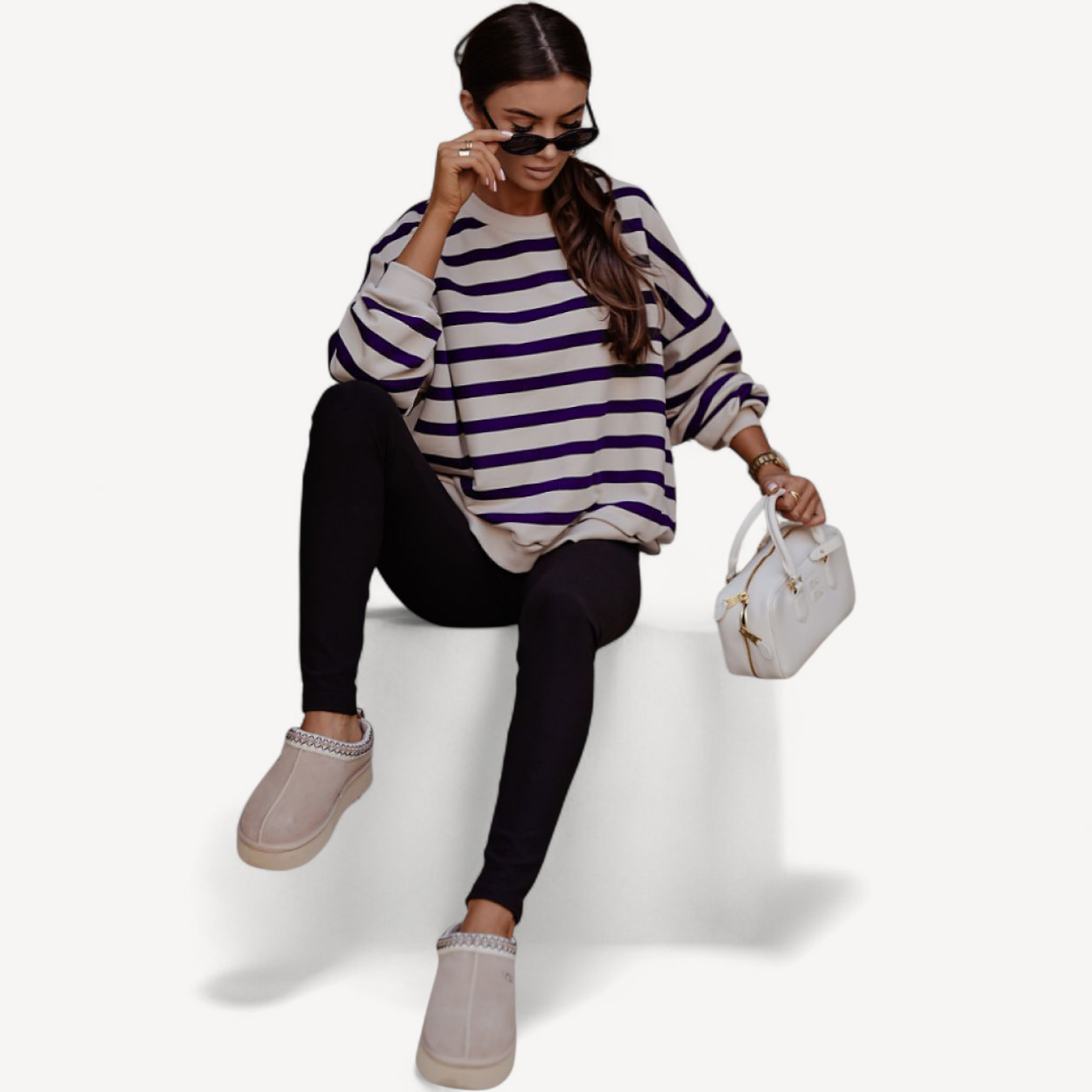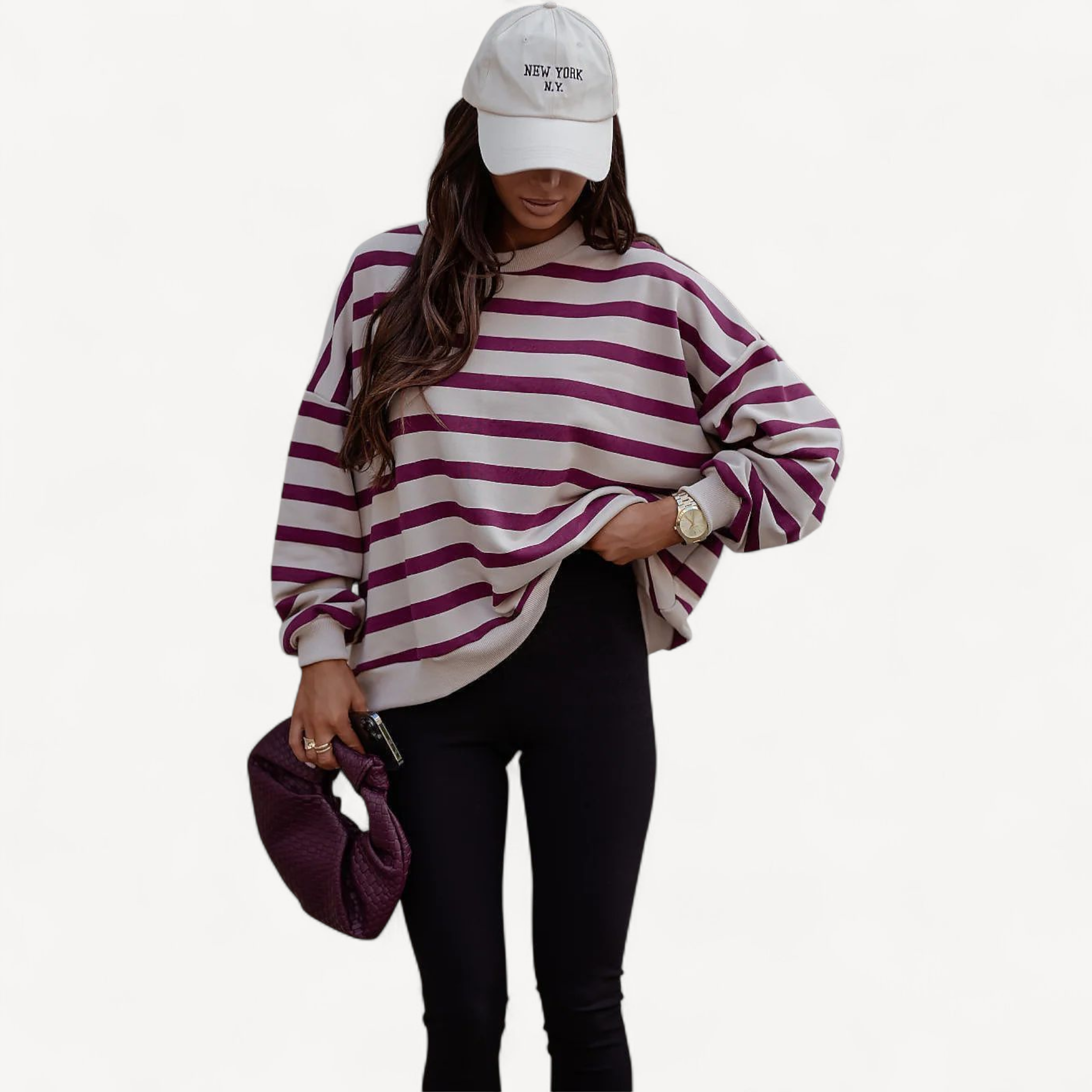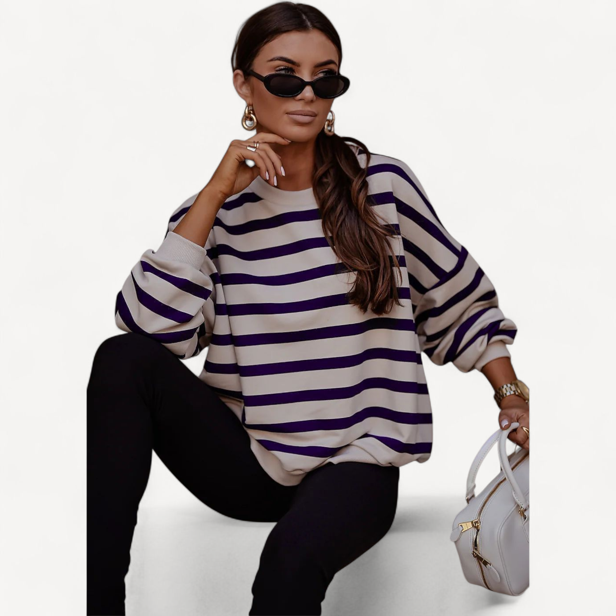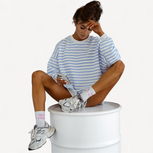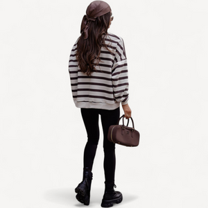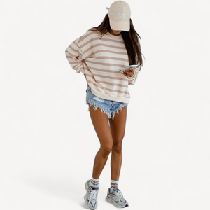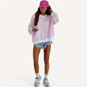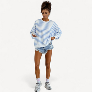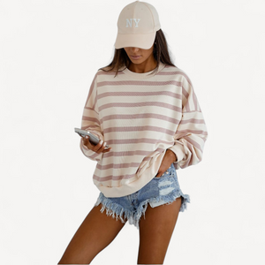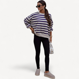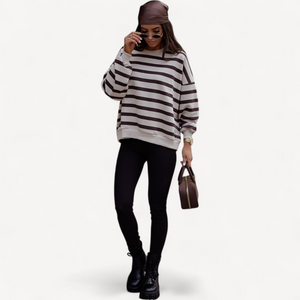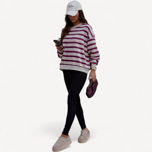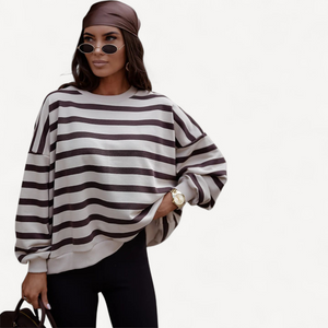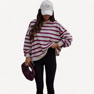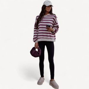Deze dames trui met losse pasvorm combineert tijdloze stijl met ultiem draagcomfort. Lange mouwen, ronde hals en een trendy streepjesprint maken hem perfect voor dagelijks gebruik, van een wandeling tot ontspannen thuis.