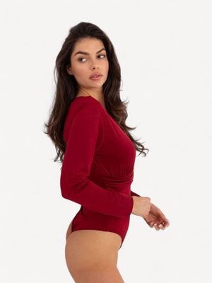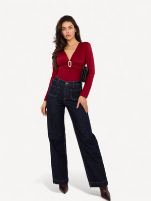 Gemaakt van een zachte mix van polyester, viscose en elastaan die je vormen mooi accentueert. De V-hals met subtiele metalen versiering de lange mouwen en haakjessluiting zorgen voor een perfecte pasvorm. prachtig met een rok of broek met hoge taille.