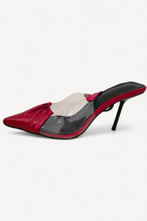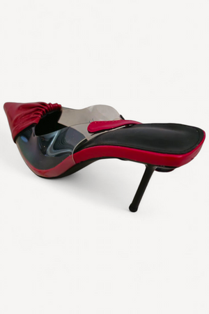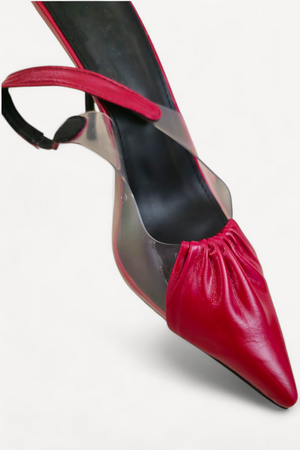 Sluw, sexy en onweerstaanbaar. Met een scherpe punt, transparante zijpanelen en een verleidelijke rode leather touch zijn deze heels meer dan schoenen – ze zijn een fashion statement. Denk: old Hollywood glamour met een futuristische twist. Perfect voor avonden waarop je niet alleen aanwezig wilt zijn, maar de spotlight volledig opeist.