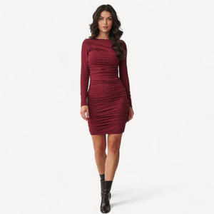 Deze elegante jurk met ritssluiting en subtiele plooien aan de achterkant combineert tijdloze stijl met verfijnde details. Perfect voor speciale gelegenheden of stijlvolle dagelijkse looks.