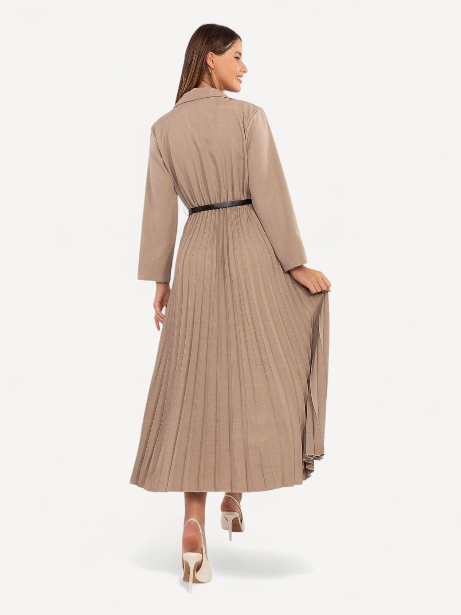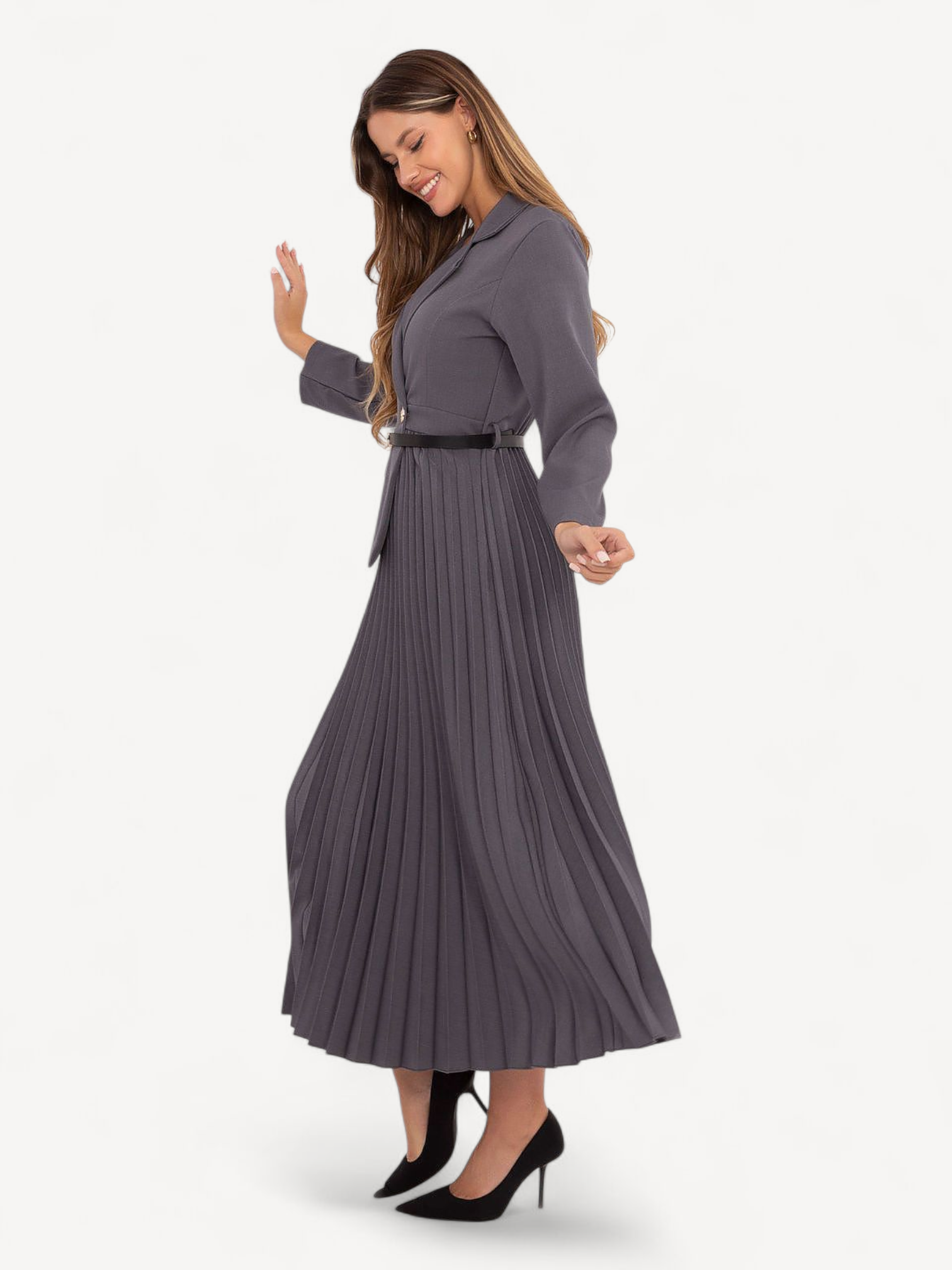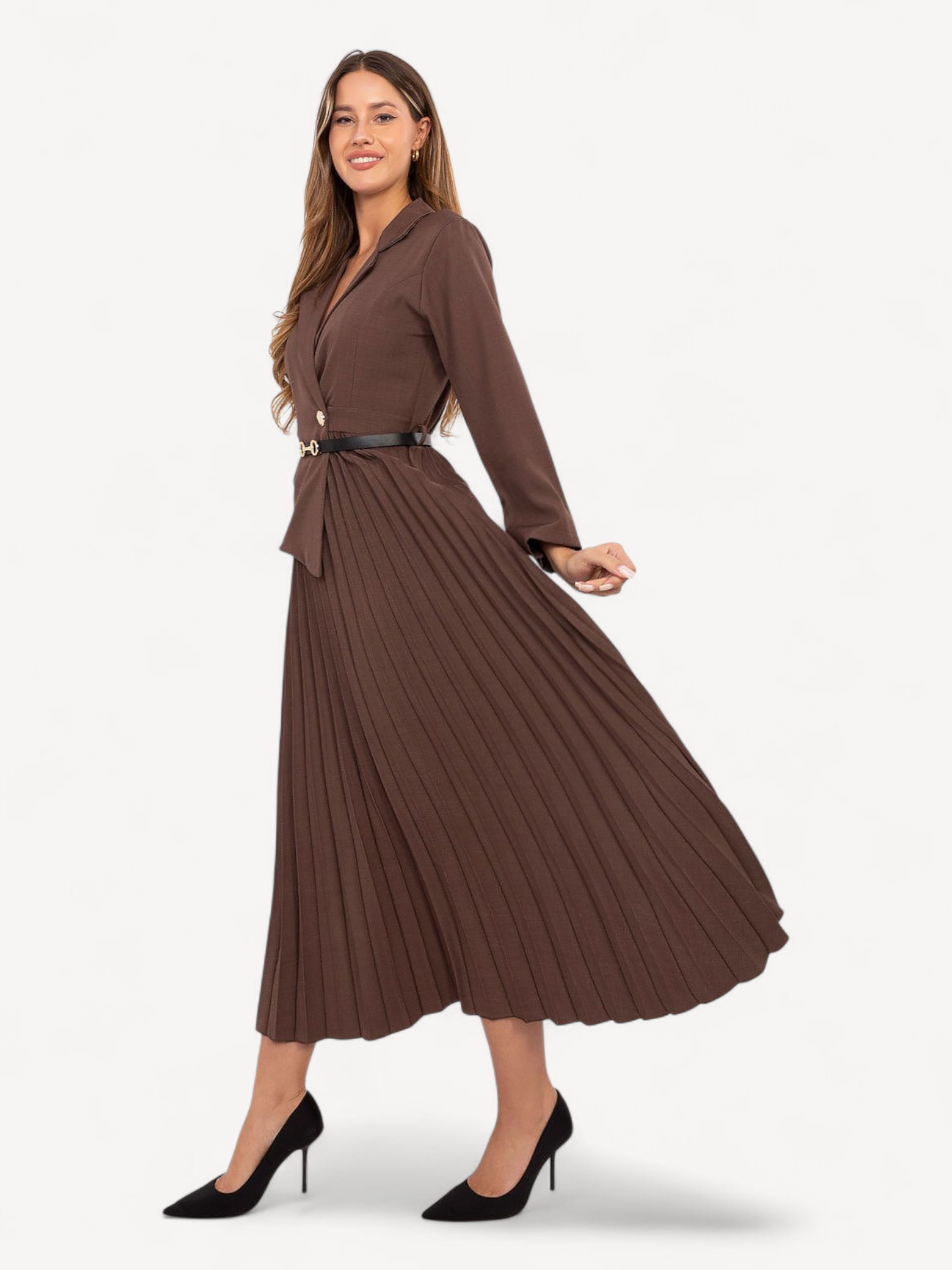 Maxi-jurk met zwierige plooirok en chique blouse-top met kraag. De ceintuur accentueert je taille, terwijl de soepele stof prachtig meebeweegt. Perfect voor werk én elegante gelegenheden.