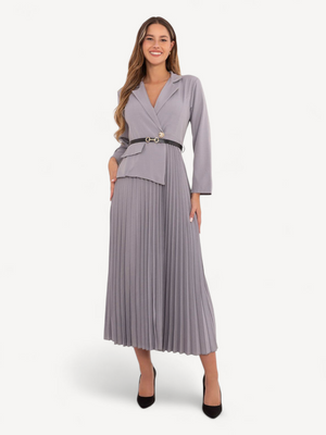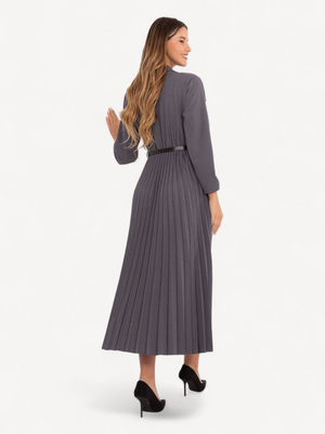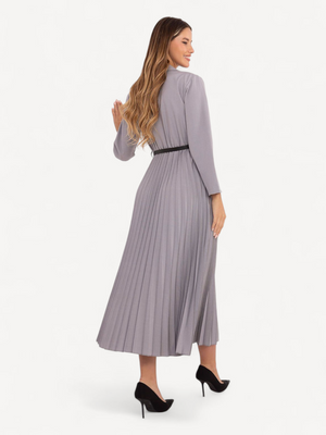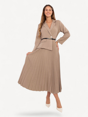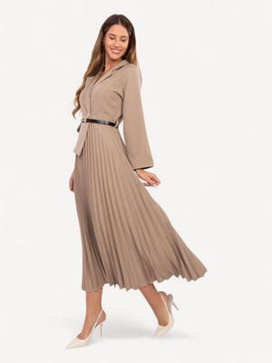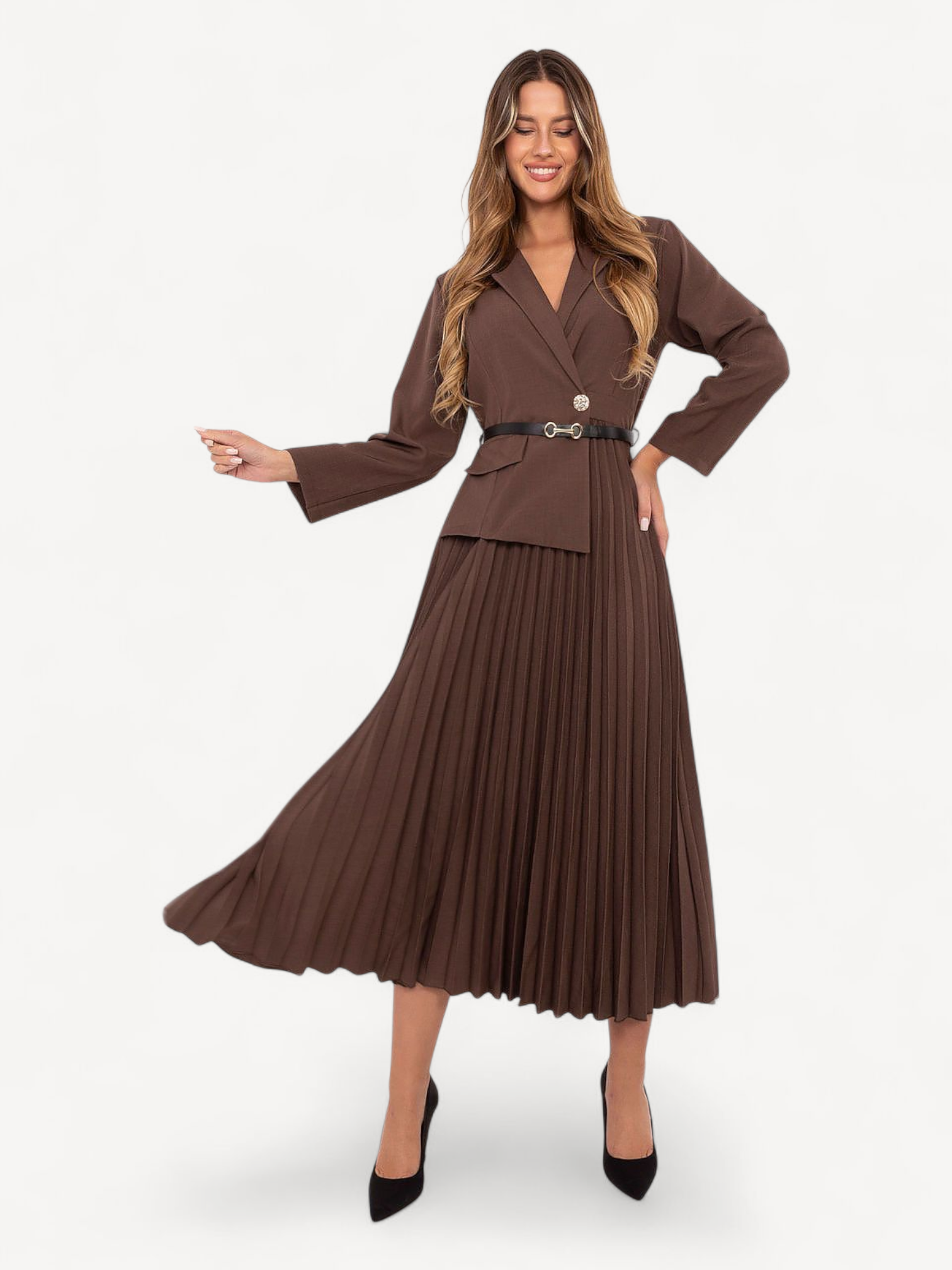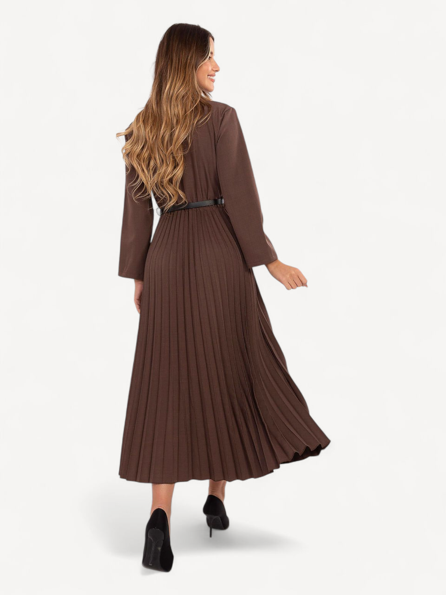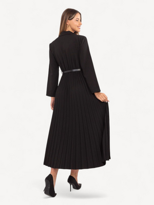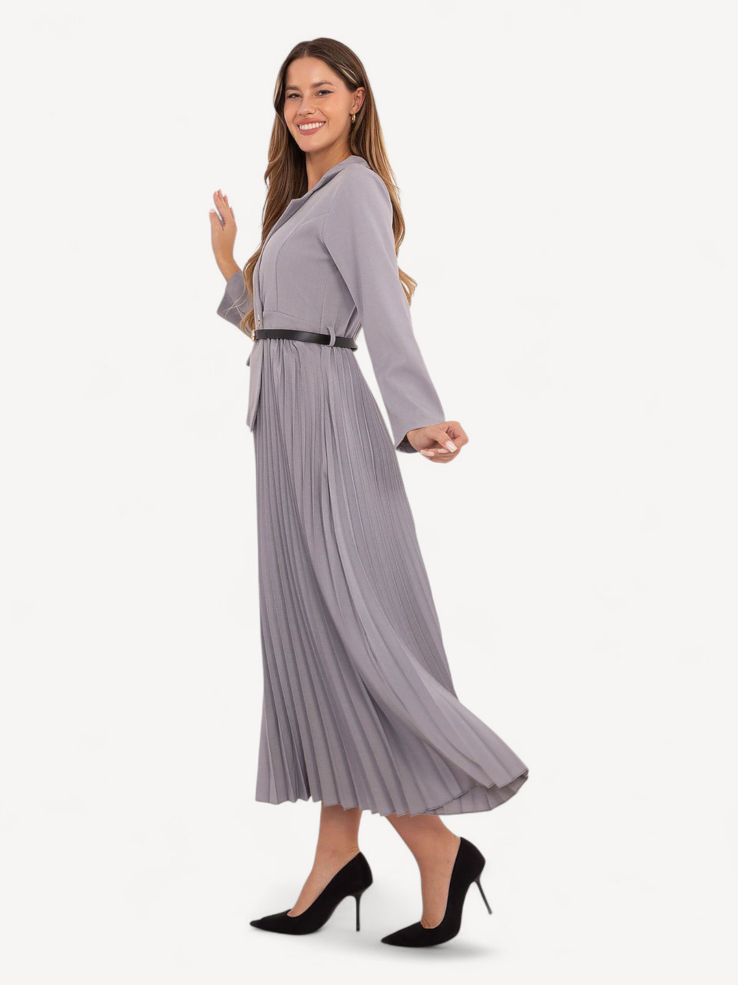 Maxi-jurk met zwierige plooirok en chique blouse-top met kraag. De ceintuur accentueert je taille, terwijl de soepele stof prachtig meebeweegt. Perfect voor werk én elegante gelegenheden.