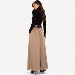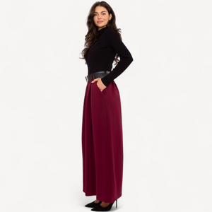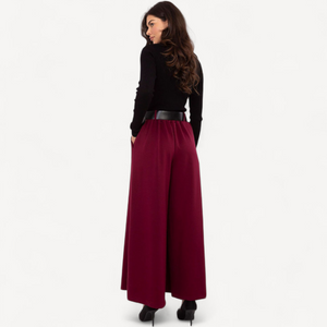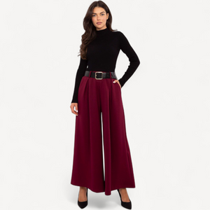 Deze dames palazzo broek combineert stijl en draagcomfort perfect. Met hoge taille, elastiek, riem, wijde pijpen en subtiele plooien creëert hij een elegante, luchtige look, terwijl de zijzakken praktische functionaliteit bieden.