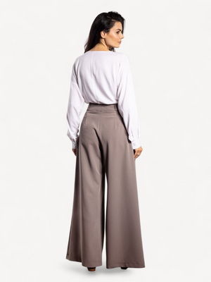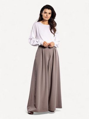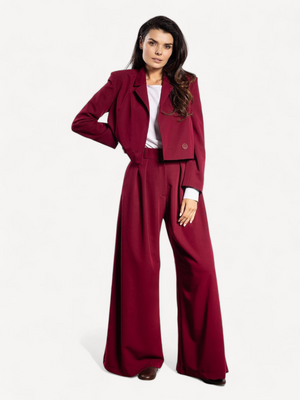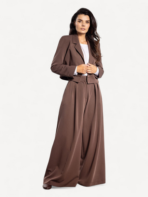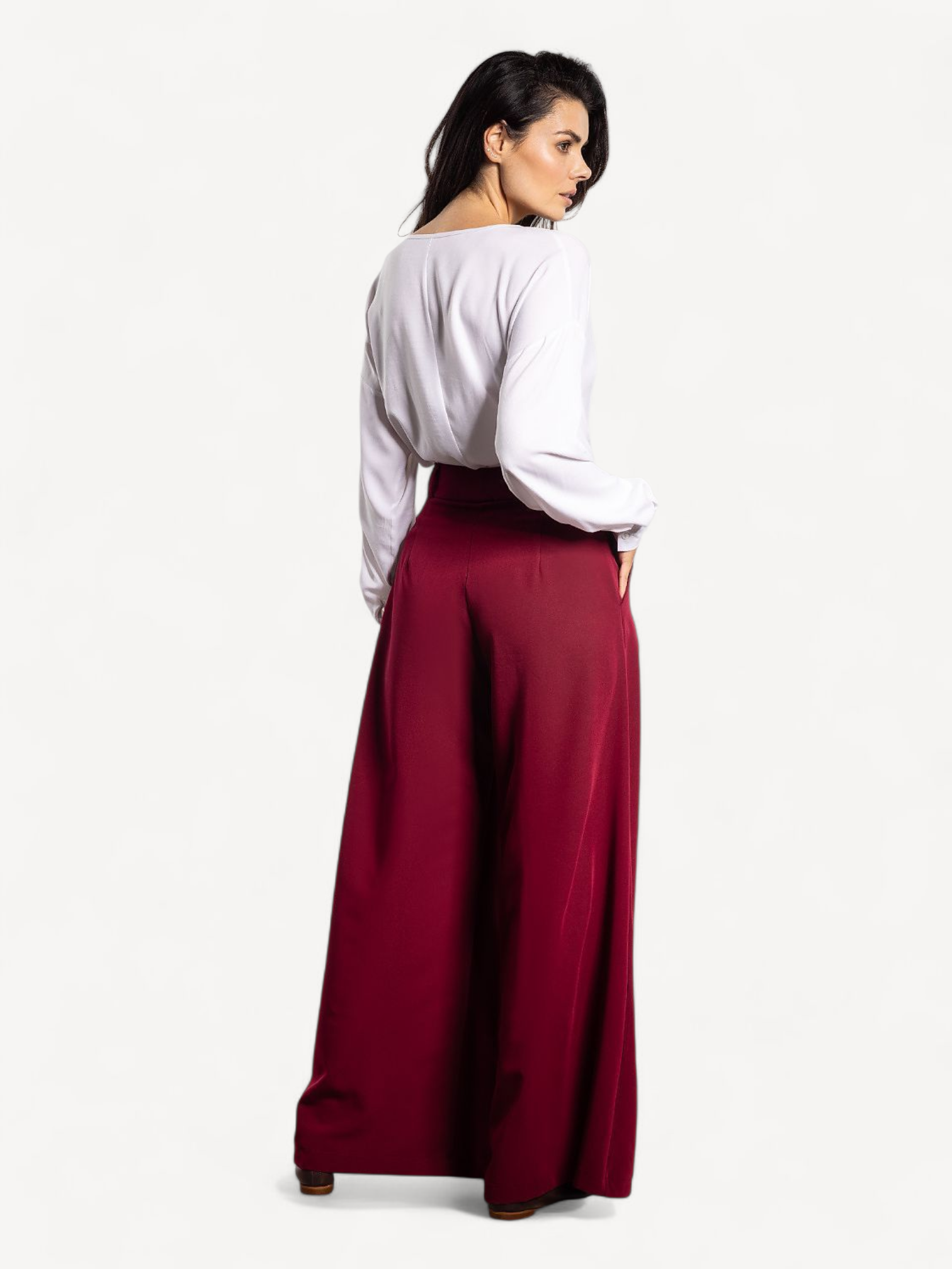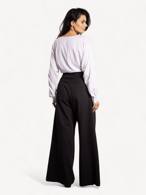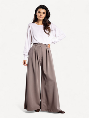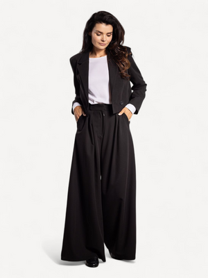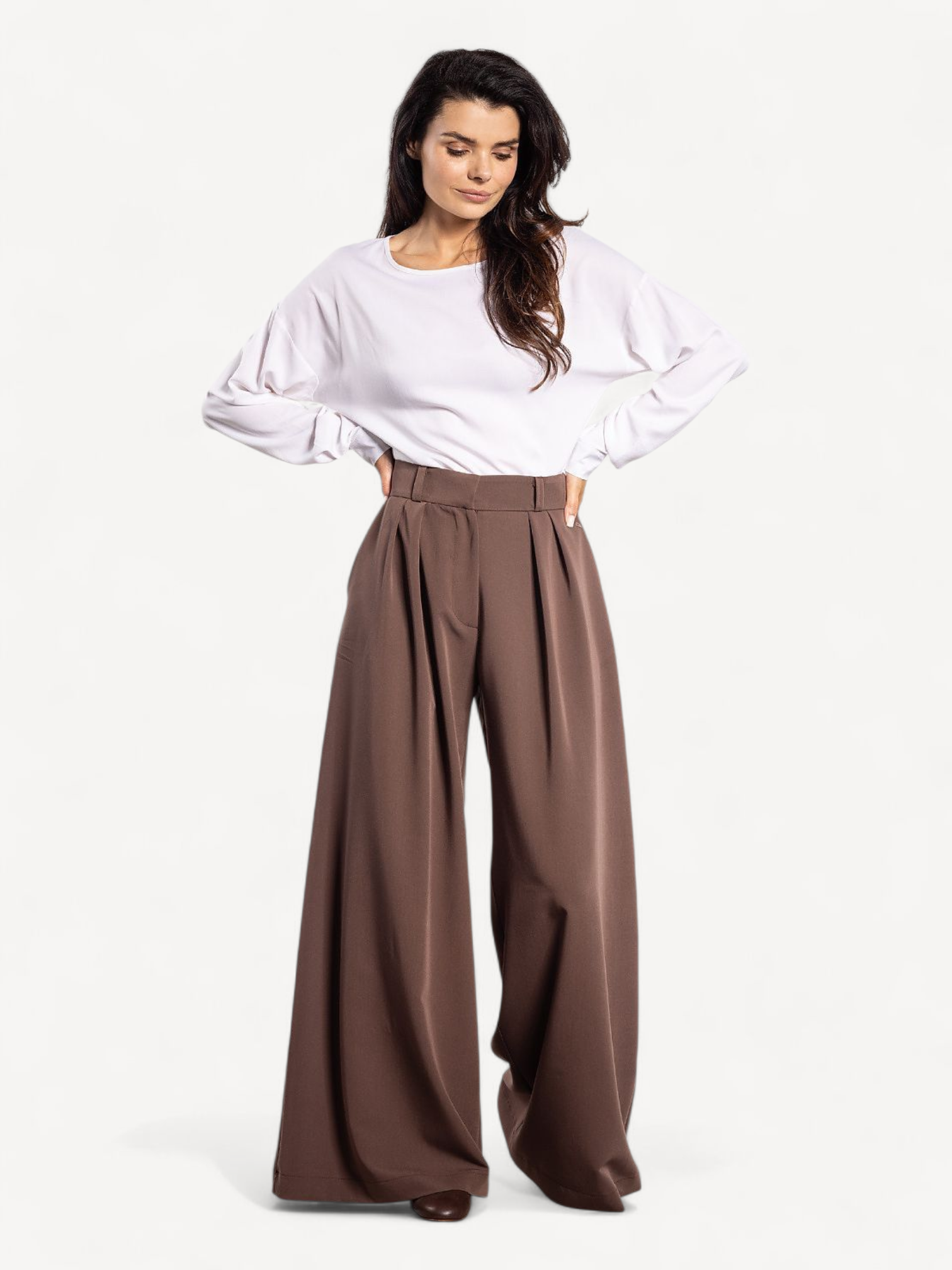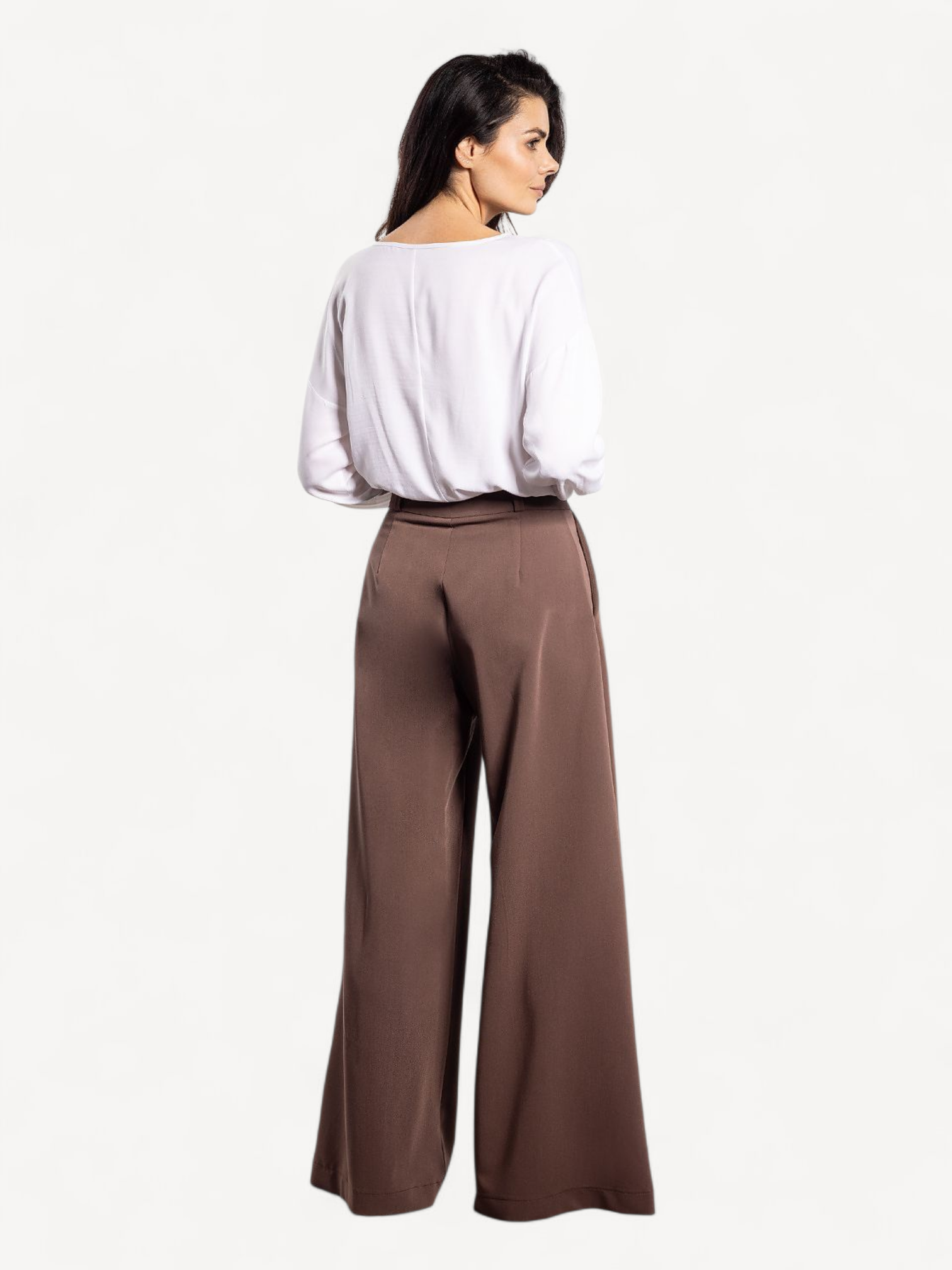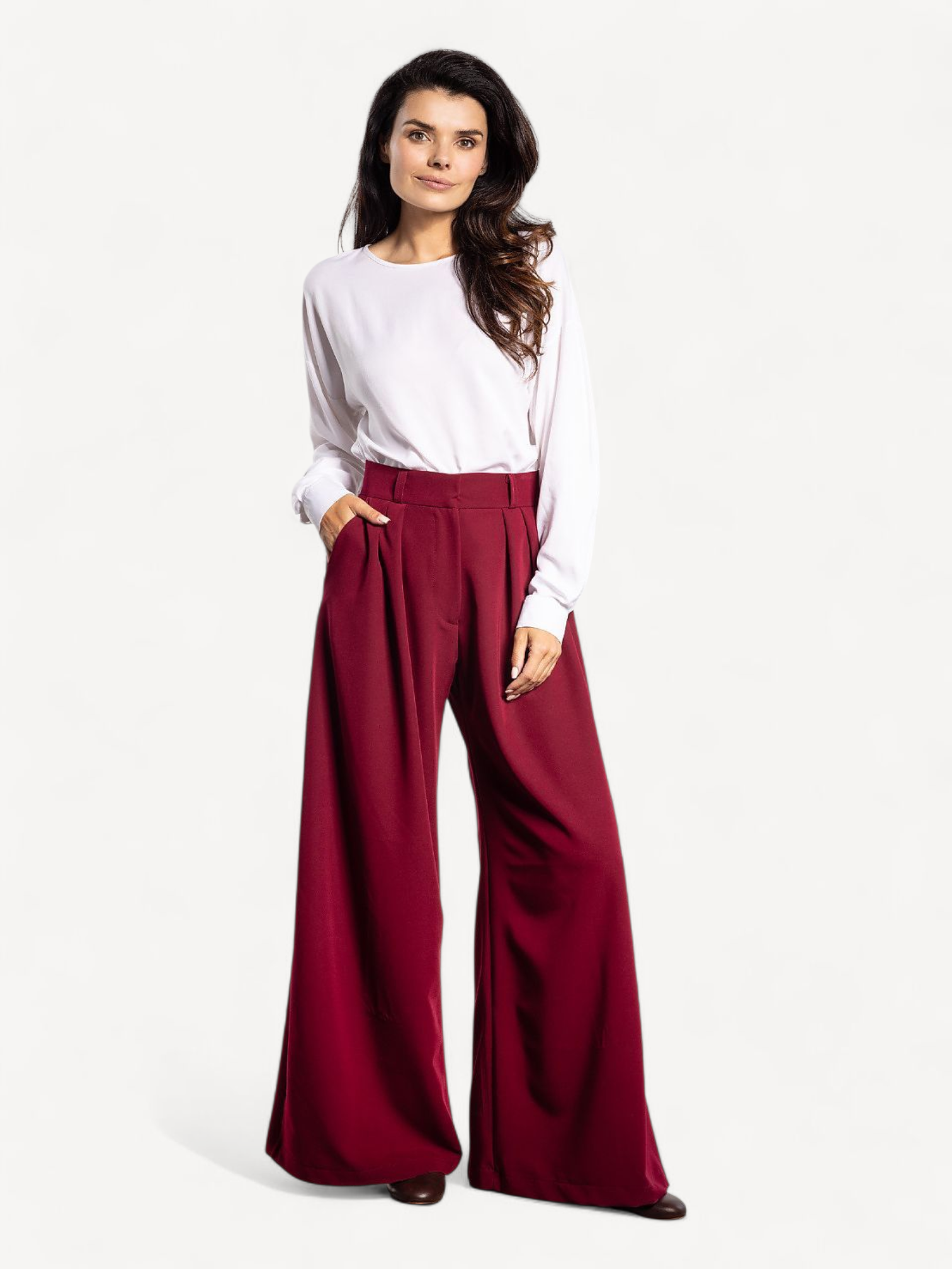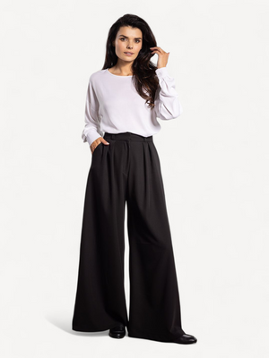 Stijlvolle broek met hoge taille en wijde pijpen. De soepele stof beweegt elegant mee, terwijl praktische zijzakken extra comfort bieden. Perfect te combineren met een blazer, blouse of trui veelzijdig en altijd in stijl.