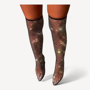 Maak indruk bij elke stap! Deze zwarte overknee laarzen met fonkelende strass details en een elegante hak van 7 cm combineren comfort met pure glamour. Perfect voor een stijlvolle en zelfverzekerde look, dag én nacht.