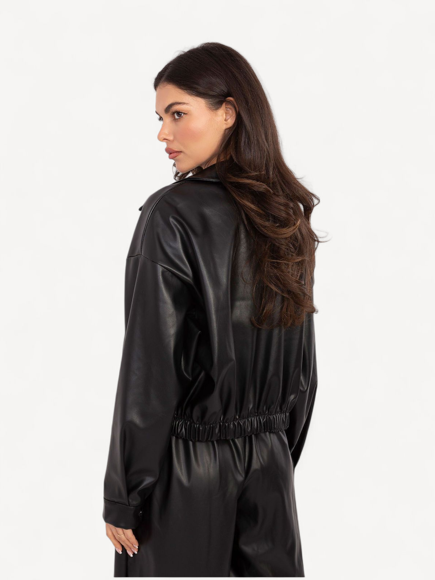 Korte, casual damesjack van imitatieleer, ideaal voor dagelijkse uitstapjes in het herfst?winter?voorjaarsseizoen. Gemaakt van een mix van polyester en polyurethaan, combineert het een trendy uitstraling met duurzaam materiaal. Het model heeft een brede kraag die karakter toevoegt, en praktische insteekzakken. De ritssluiting zorgt voor gemakkelijk gebruik, en de gladde stof benadrukt het minimalistische, moderne ontwerp. Het jack is perfect als lichte isolatielaag op koudere dagen, waarbij functionaliteit wordt gecombineerd met een trendy casual stijl.
