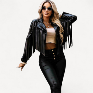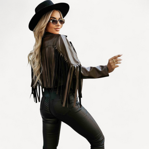 Dit bikerjack met franjes in burgundy combineert edgy stijl met opvallende details. Het hoogwaardige imitatieleer en contrasterende franjes maken het een echte eyecatcher, perfect voor zowel dagelijkse looks als een gedurfde avondoutfit.