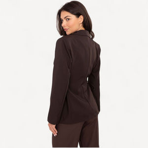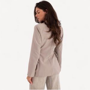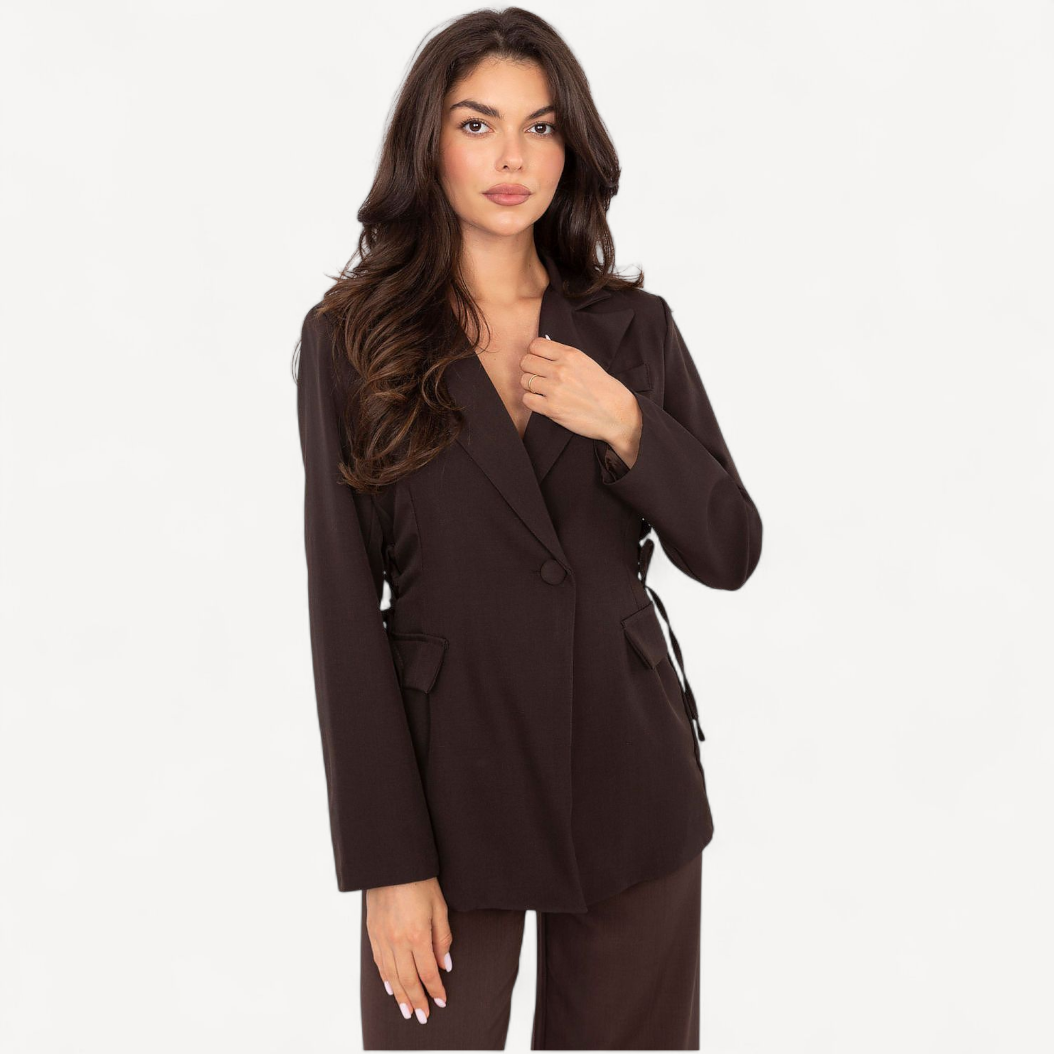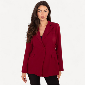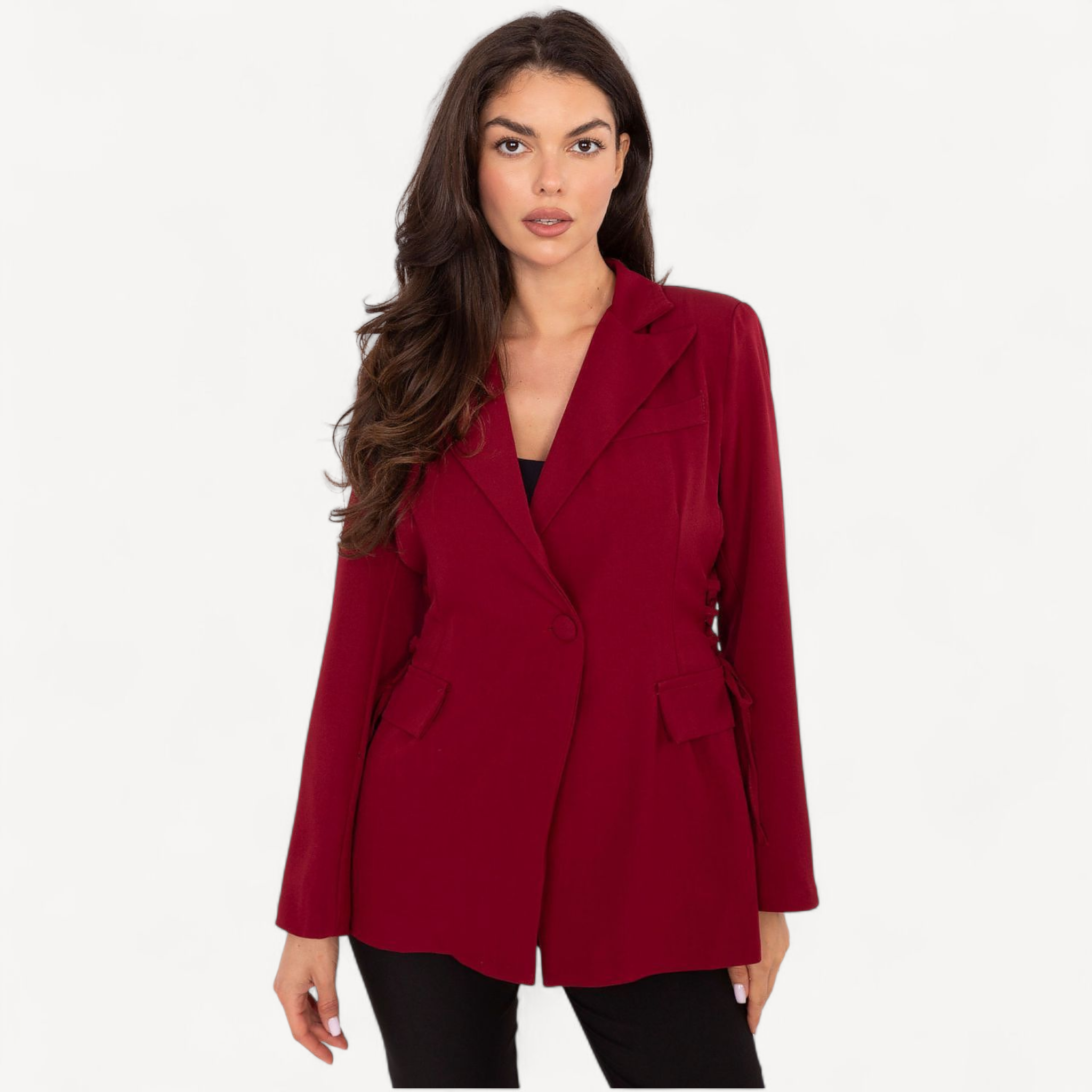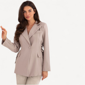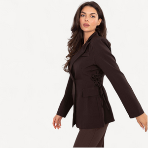 Deze stijlvolle blazer combineert klassiek met een edgy twist: het subtiele vetersdetail aan de zijkant geeft jouw outfit nét dat beetje extra. Perfect om je vrouwelijke silhouet te accentueren en tegelijkertijd een krachtige uitstraling neer te zetten.