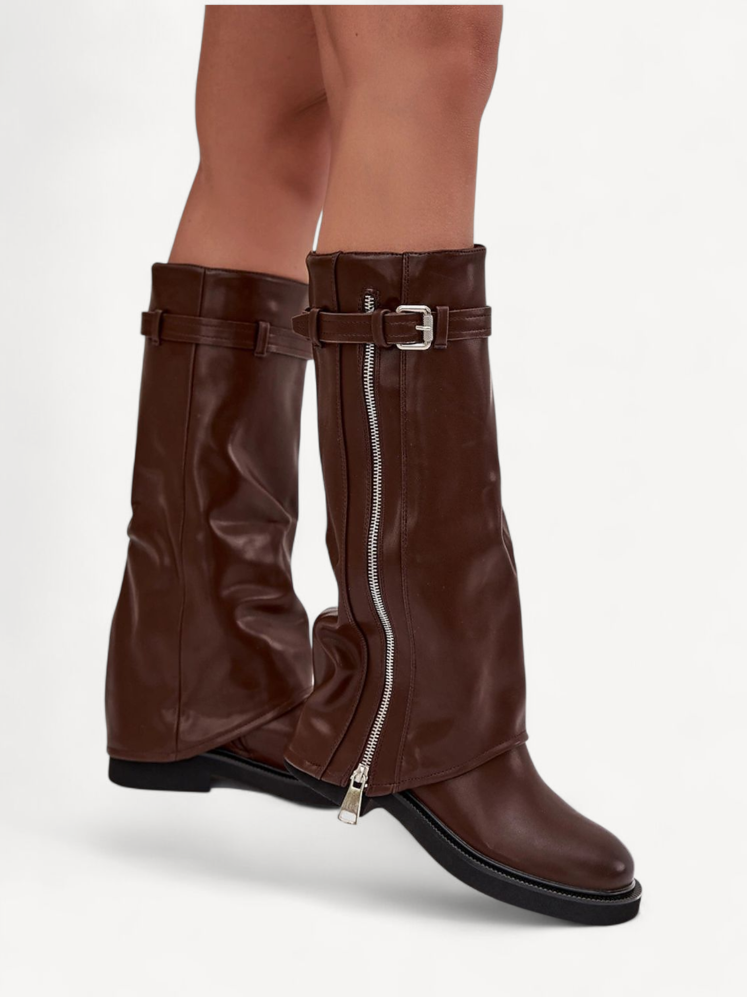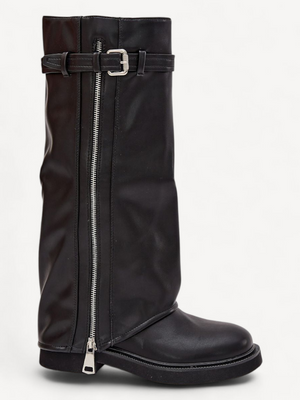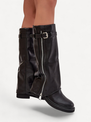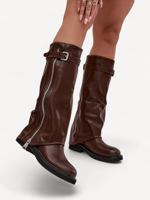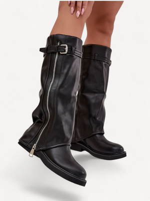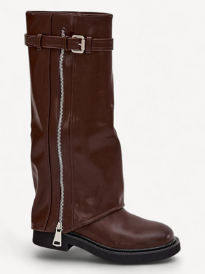 Stijlvolle dameslaarzen met omgeslagen schacht en warme bontvoering perfect voor het herfst-winterseizoen. Gemaakt van hoogwaardig imitatieleer met riemdetail en zilverkleurige rits voor een modieuze touch. Ideaal bij zowel broeken als jurken.