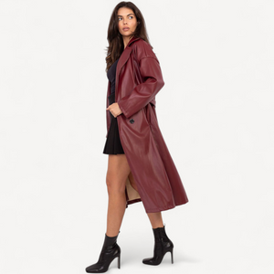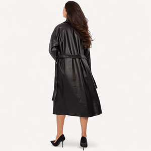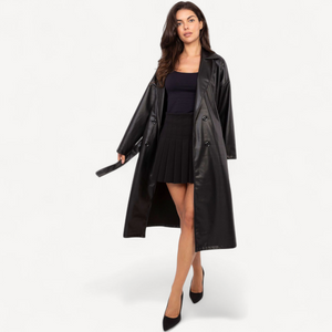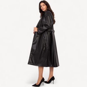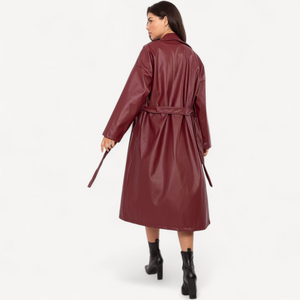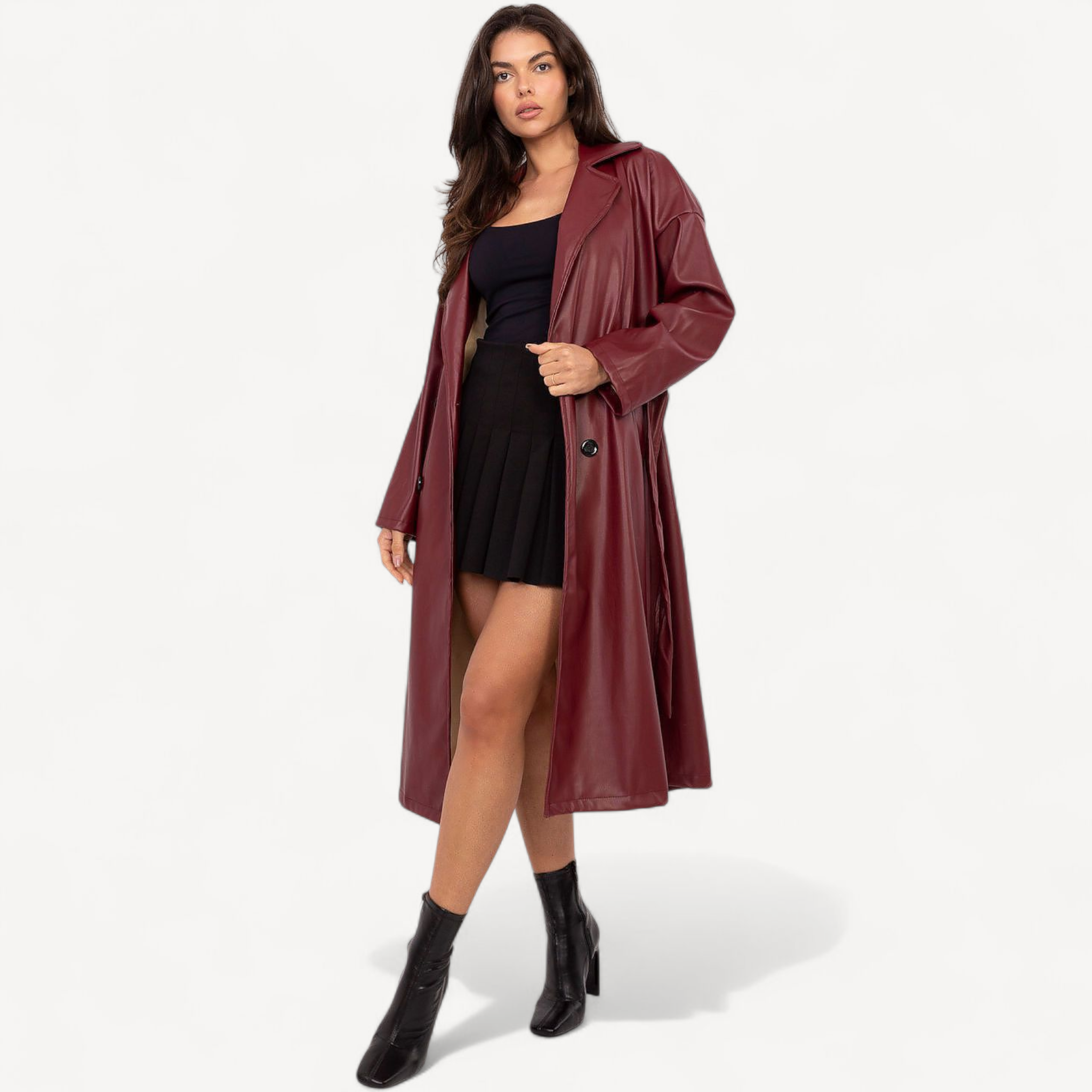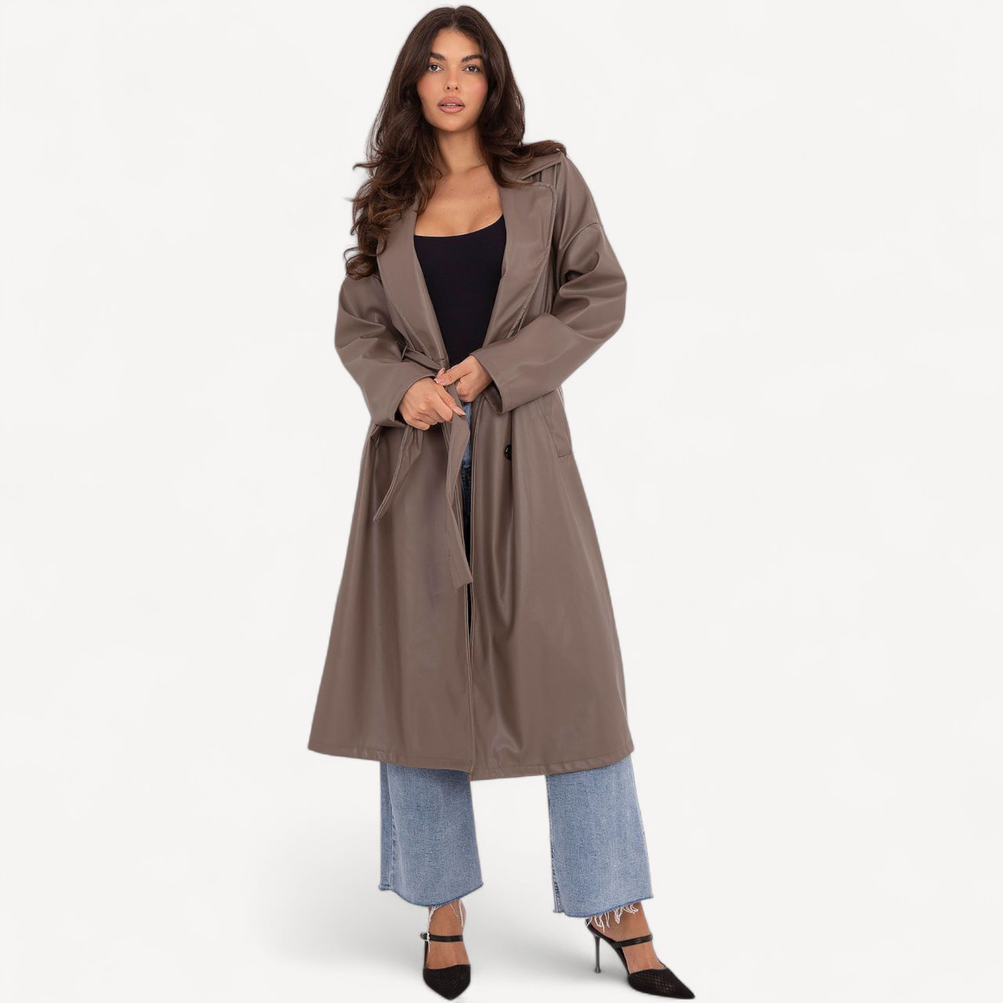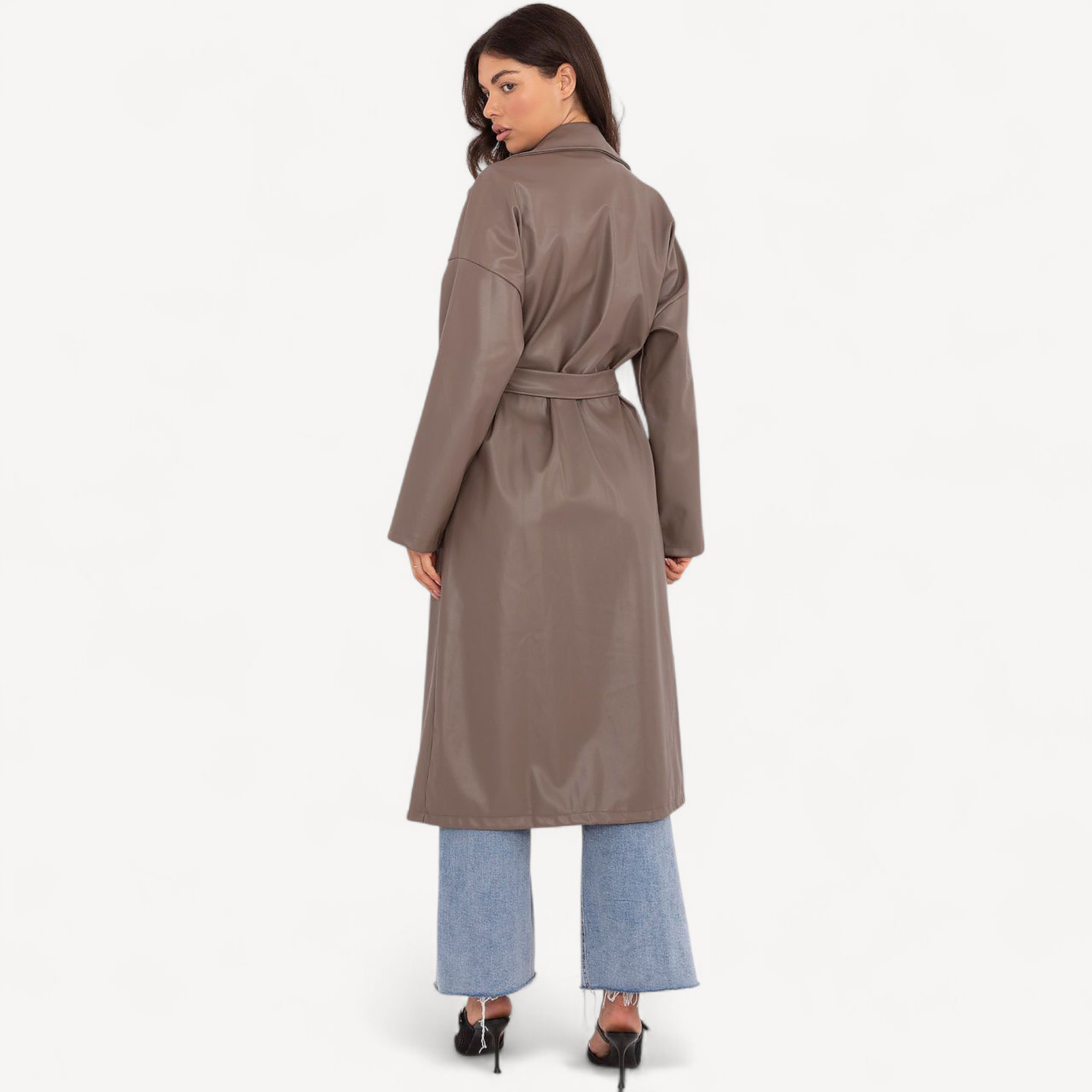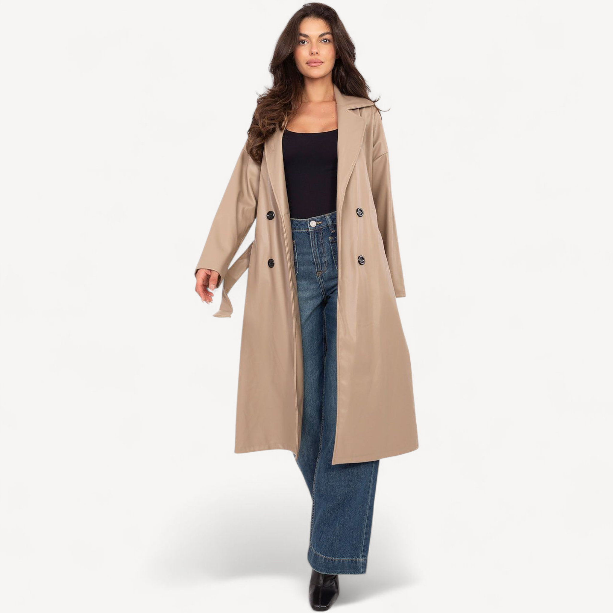Deze dames leren jas combineert casual charme met elegante details. Met klassieke revers, steekzakken, dubbele knopen en een verstelbare tailleband geef je je silhouet moeiteloos vorm.