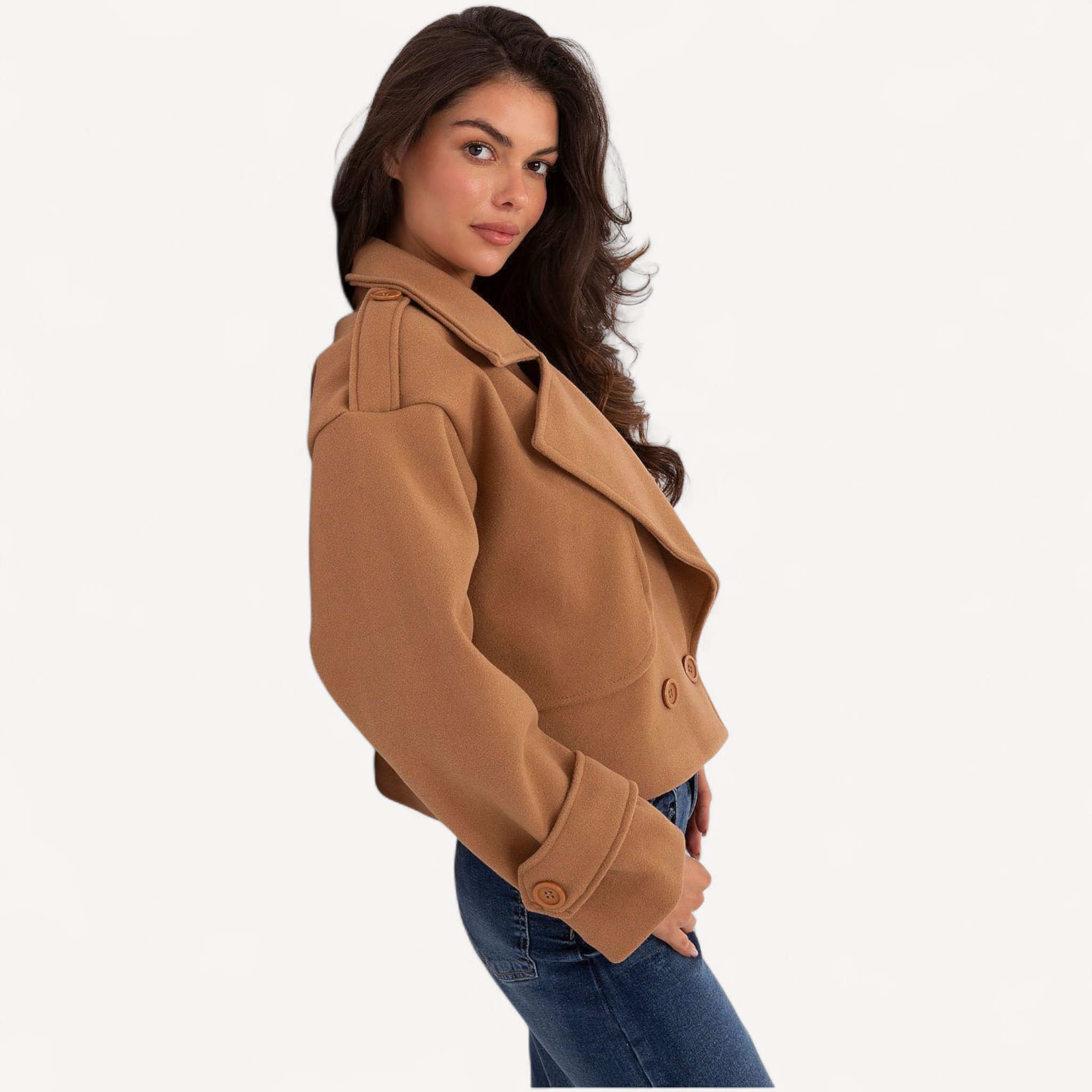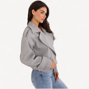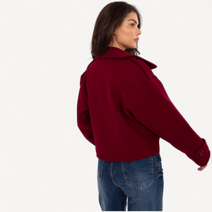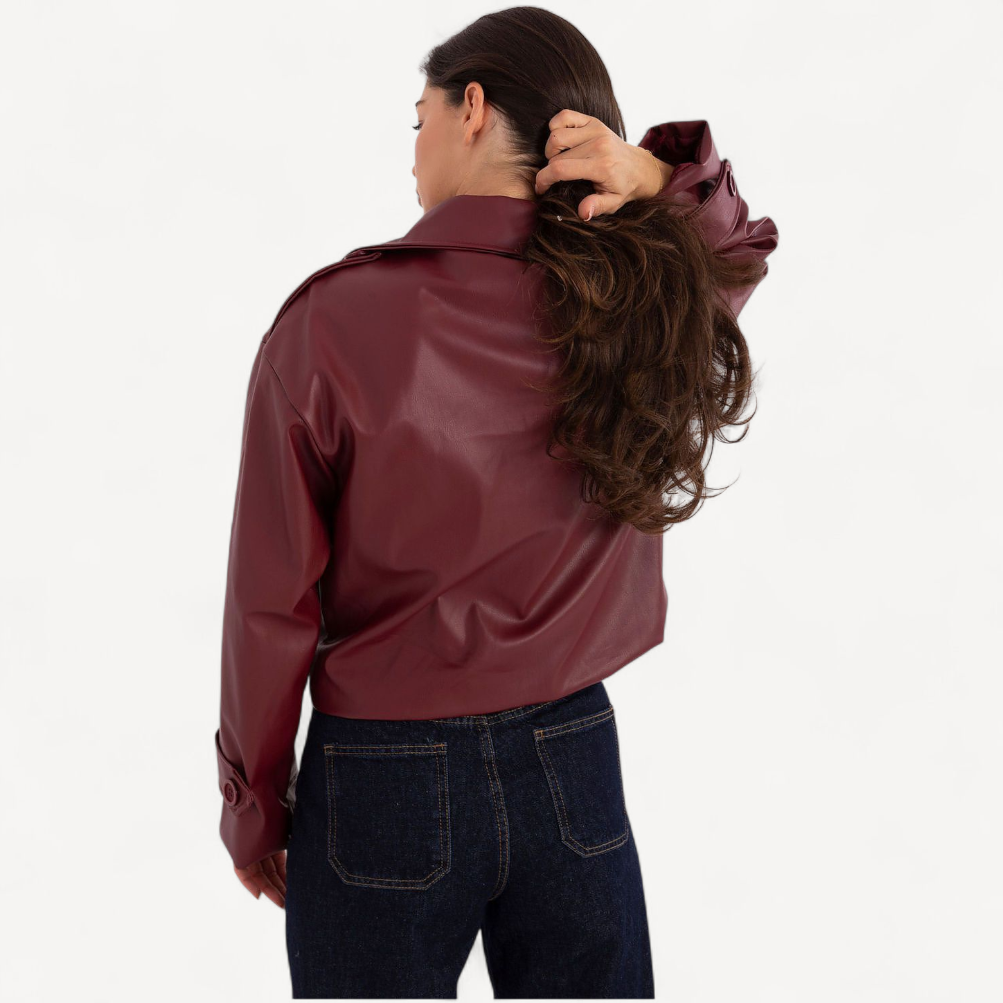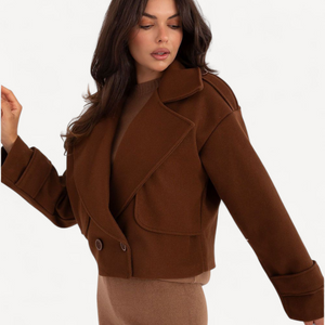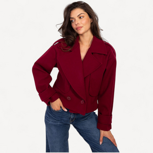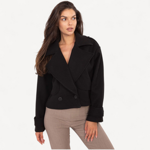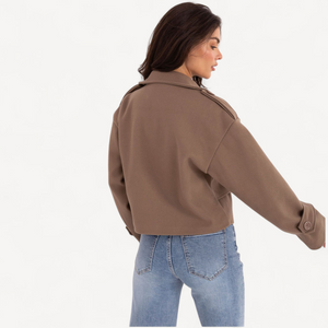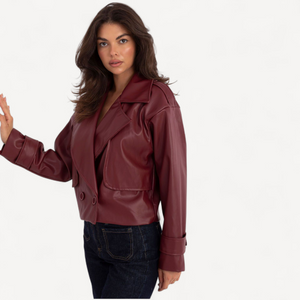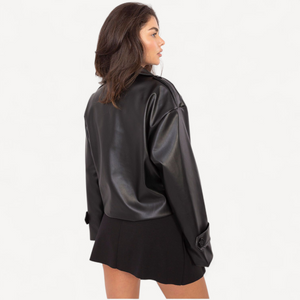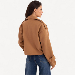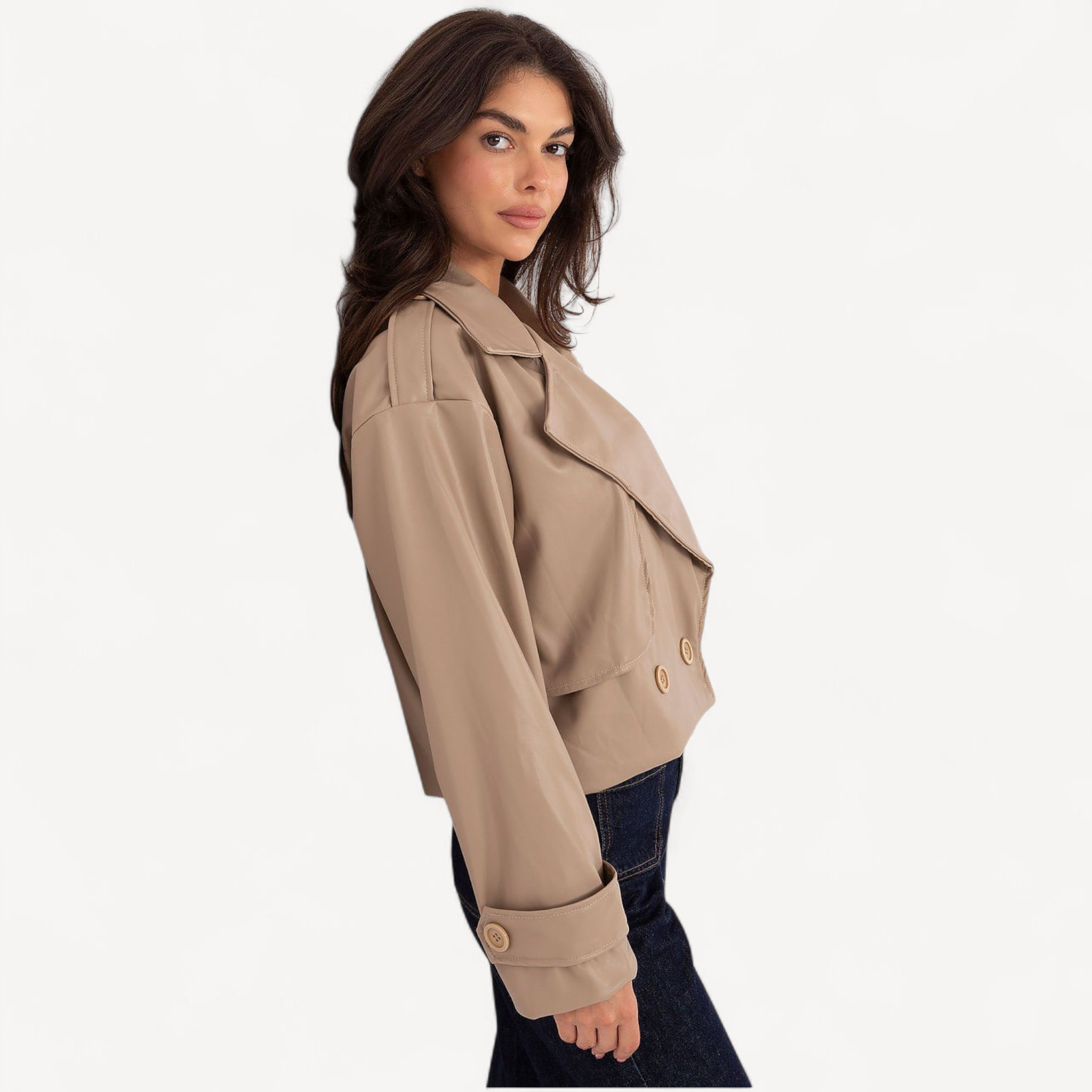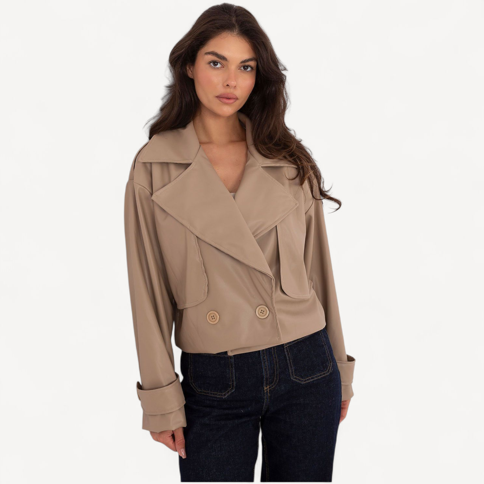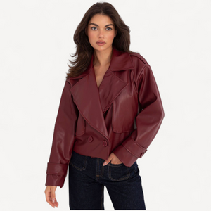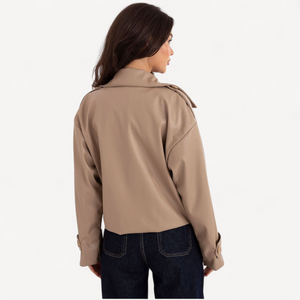 Deze korte dames trenchcoat van imitatieleer combineert tijdloze elegantie met een casual, eigentijdse look. De grote kraag, brede revers en epauletten geven karakter, terwijl de dubbele knoopsluiting de klassieke trenchstijl benadrukt.