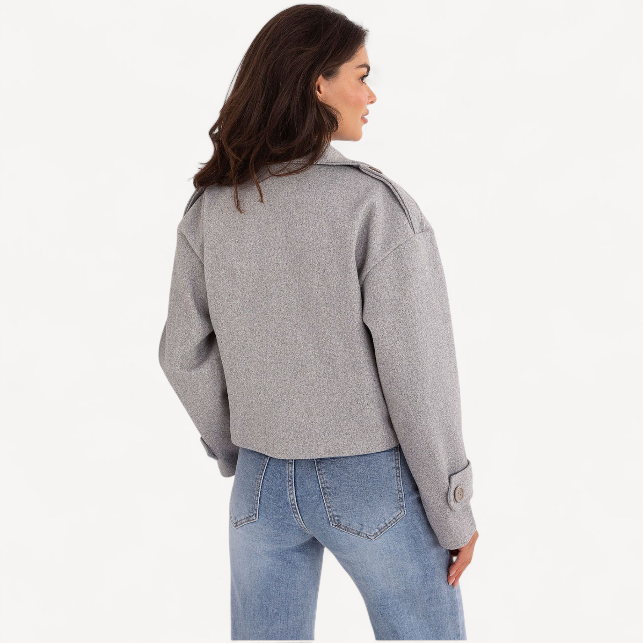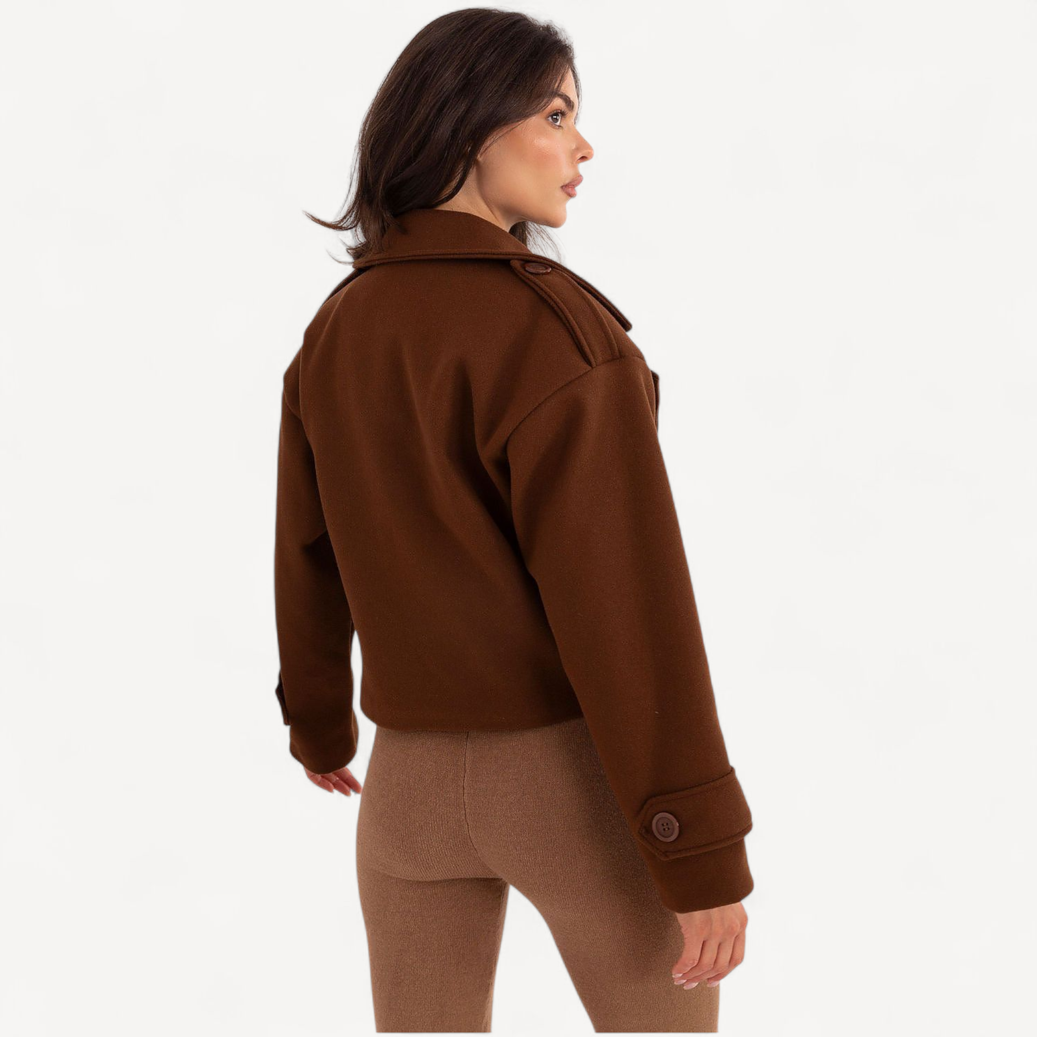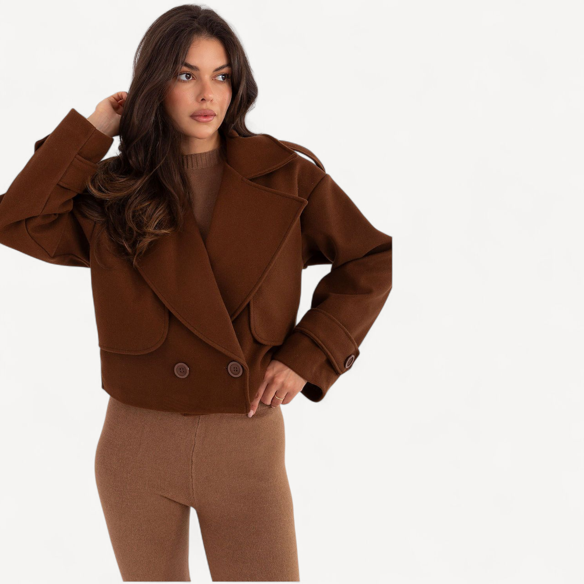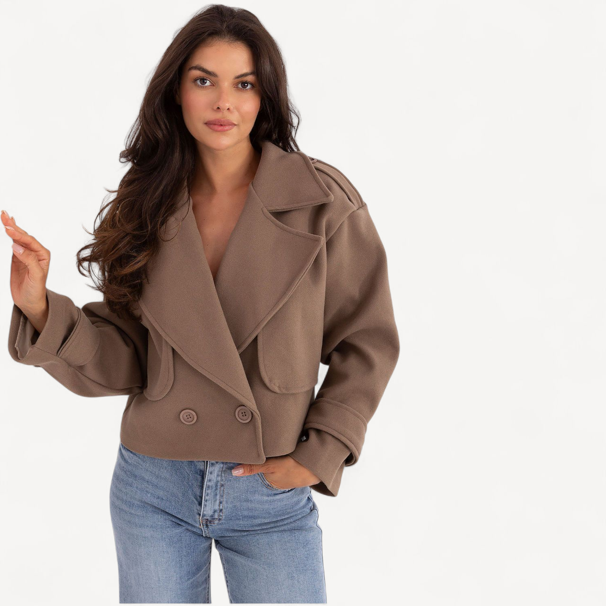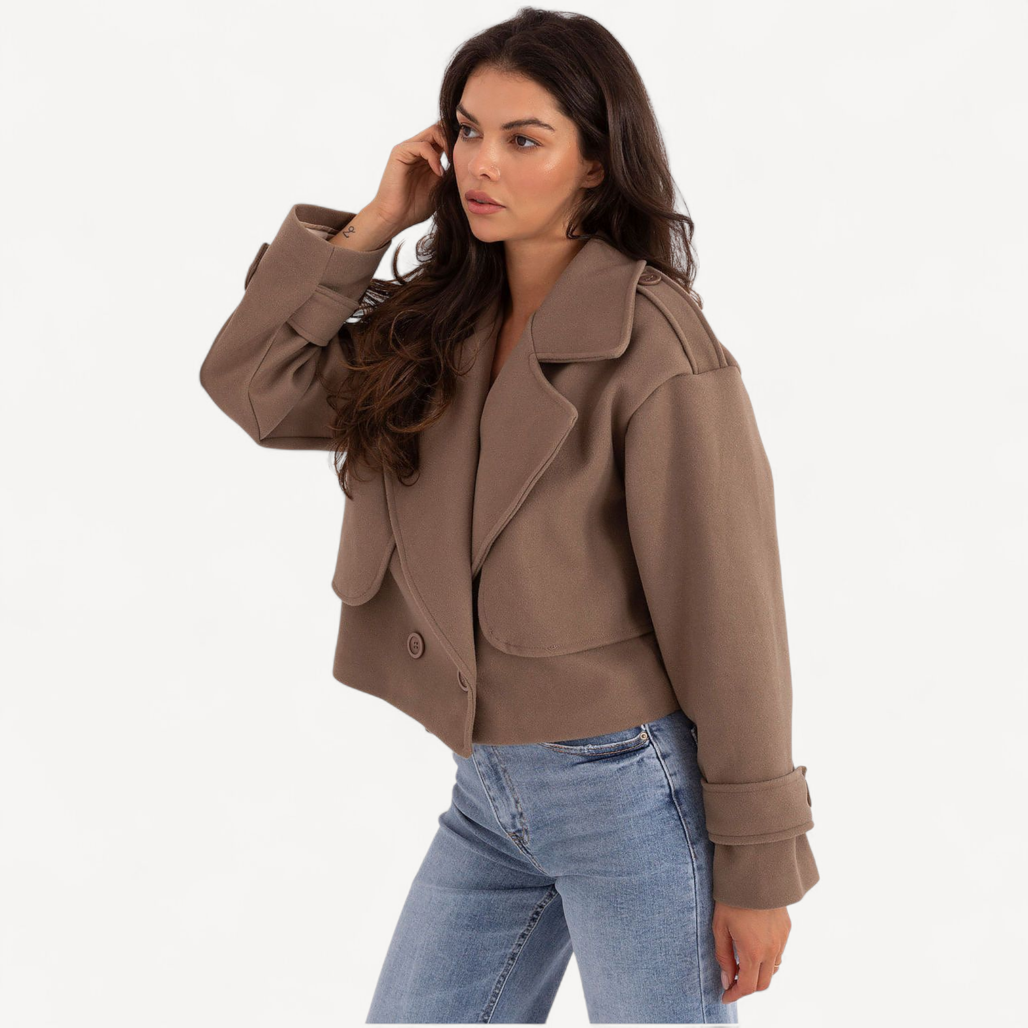 Deze korte dames trenchcoat van imitatieleer combineert tijdloze elegantie met een casual, eigentijdse look. De grote kraag, brede revers en epauletten geven karakter, terwijl de dubbele knoopsluiting de klassieke trenchstijl benadrukt.