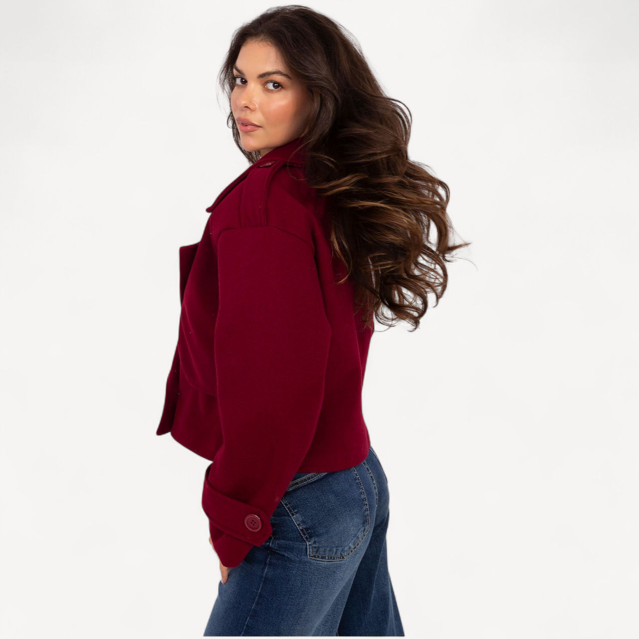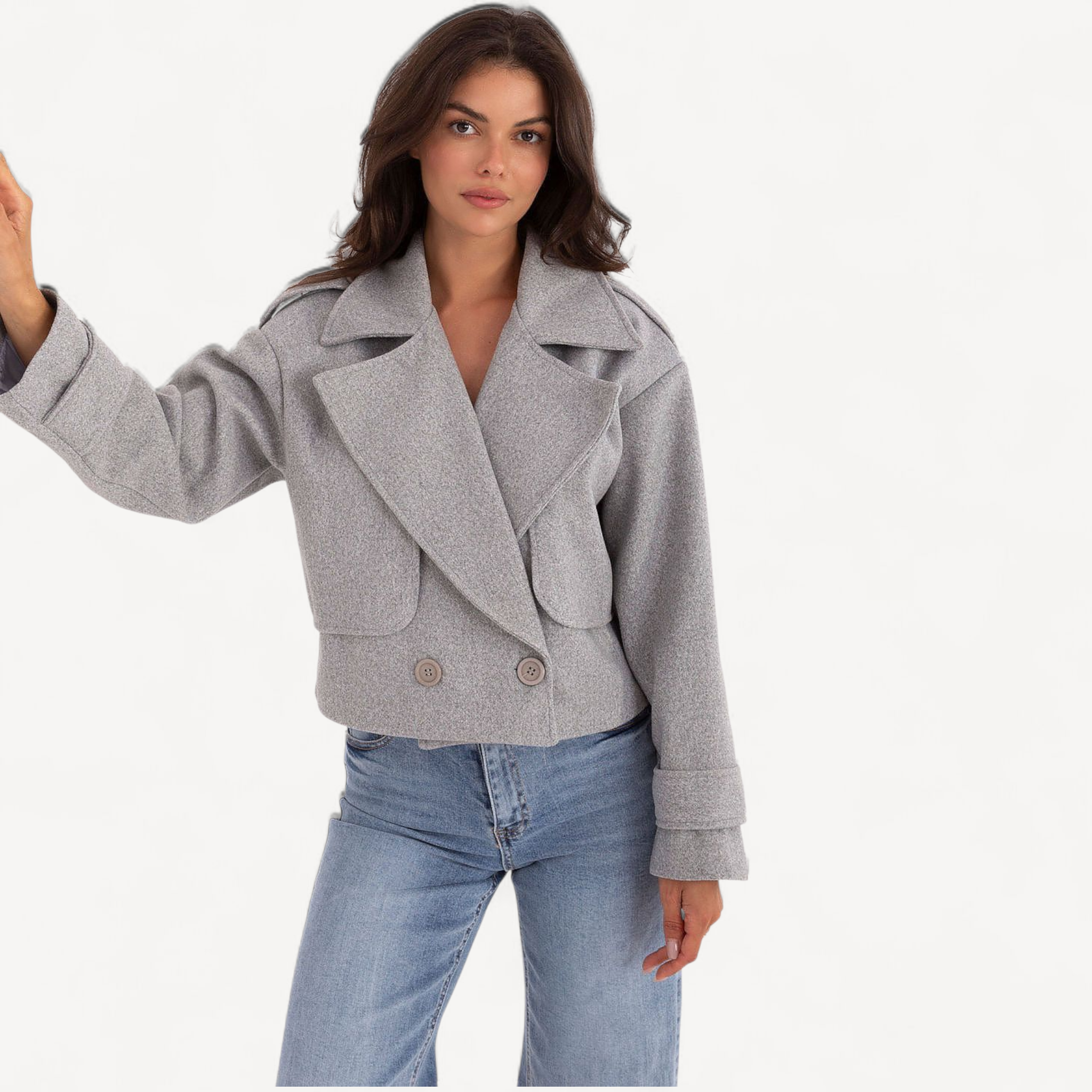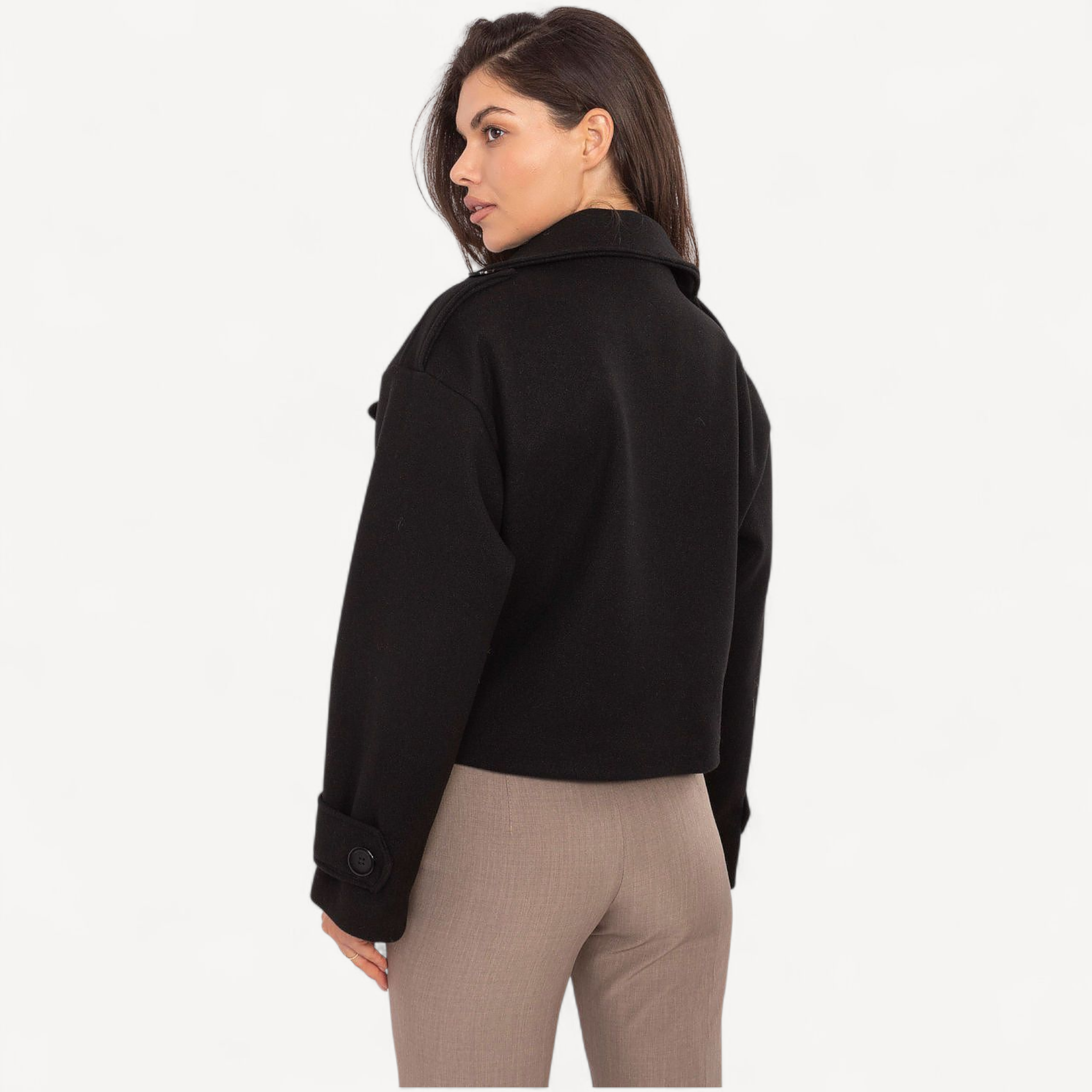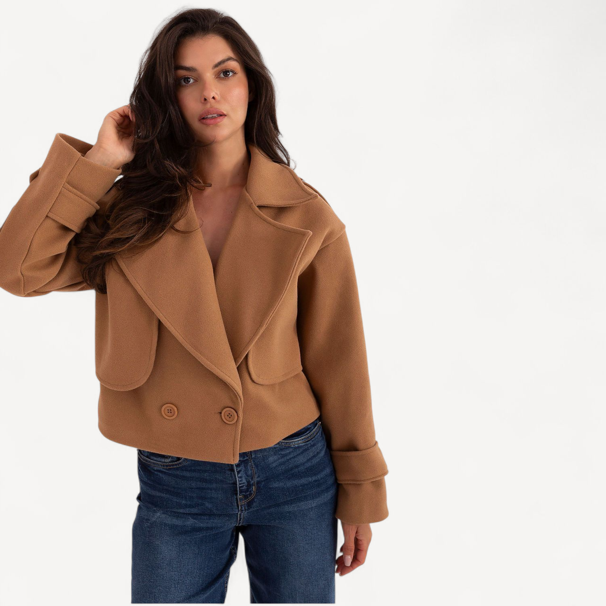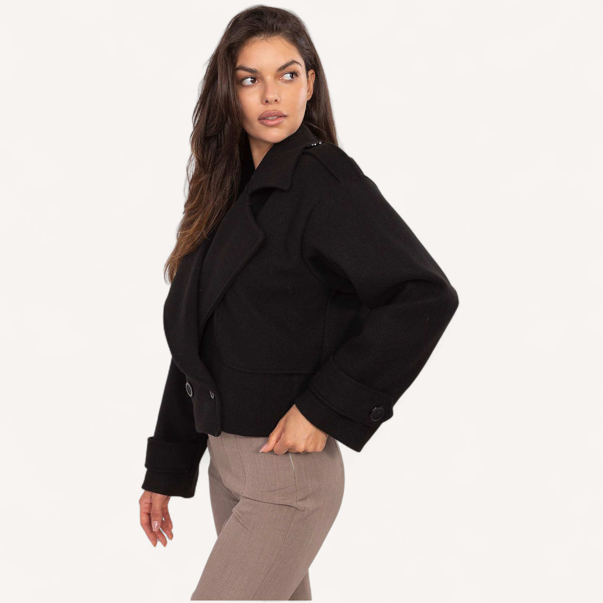 Deze korte dames trenchcoat van imitatieleer combineert tijdloze elegantie met een casual, eigentijdse look. De grote kraag, brede revers en epauletten geven karakter, terwijl de dubbele knoopsluiting de klassieke trenchstijl benadrukt.
