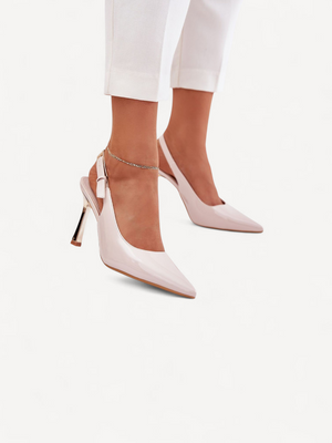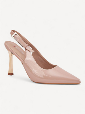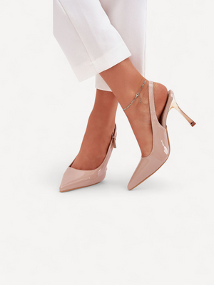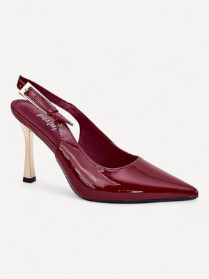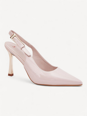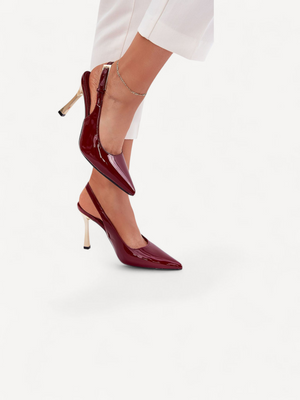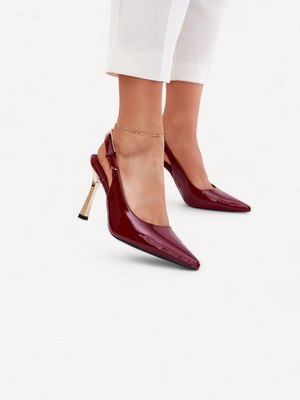Deze gelakte hakken met open hiel combineren klassieke elegantie met moderne details. Puntige neus en verstelbare gesp zorgen voor een perfecte pasvorm, ideaal voor avondkleding en speciale gelegenheden.