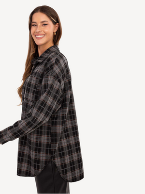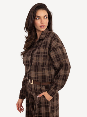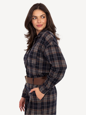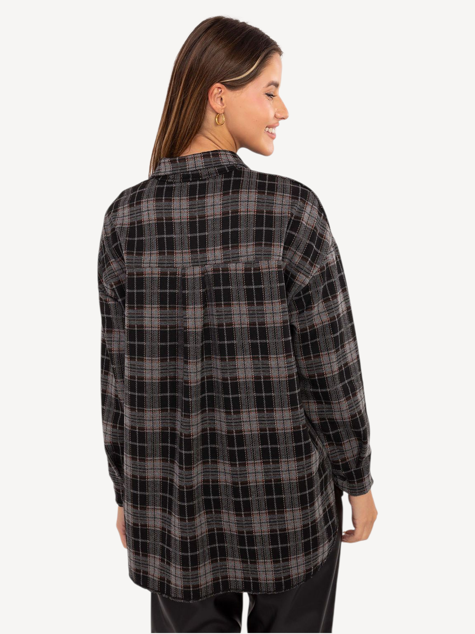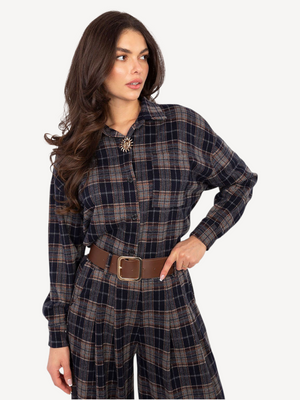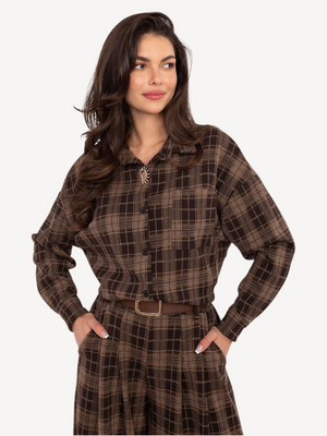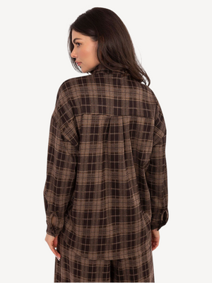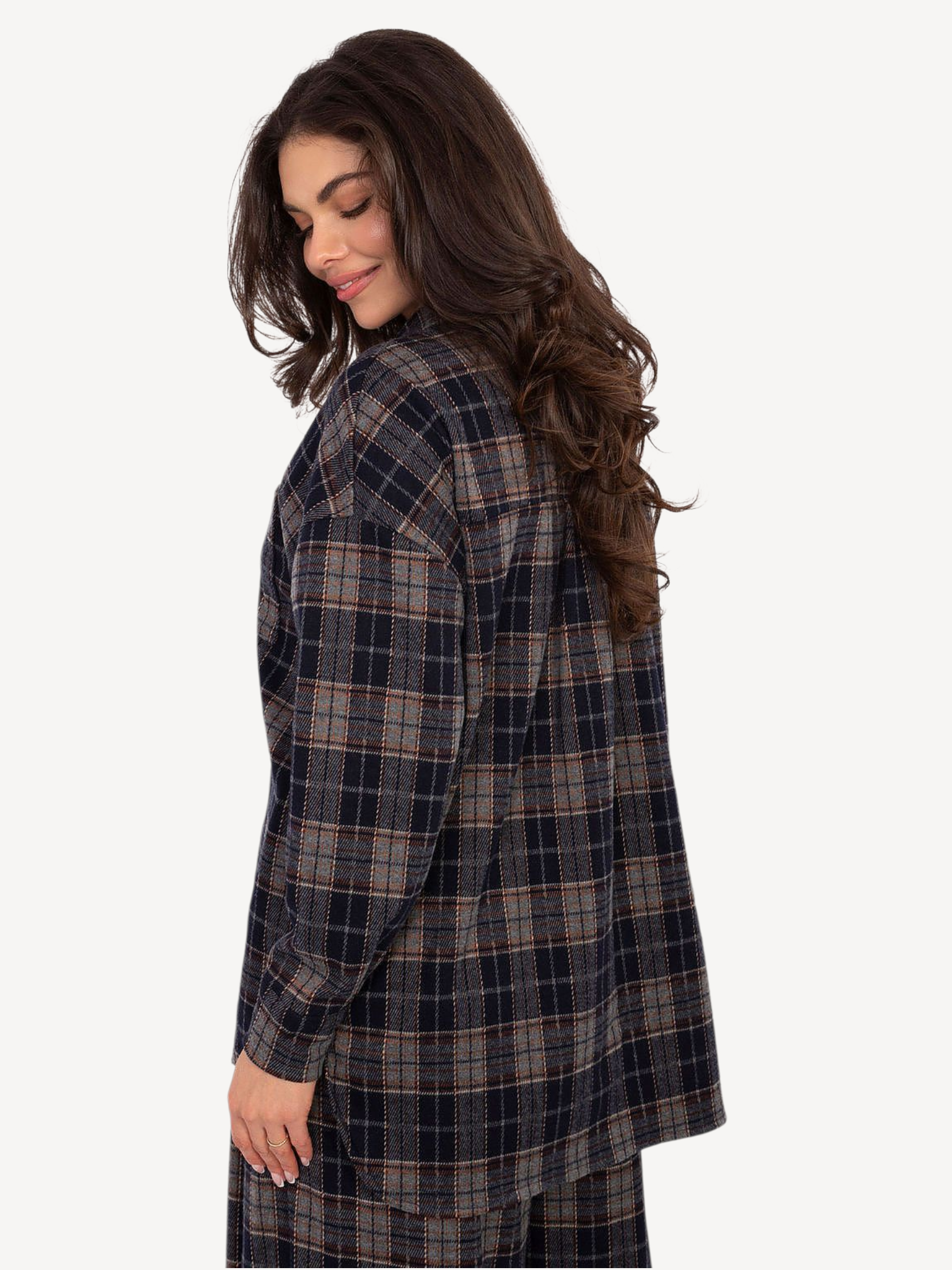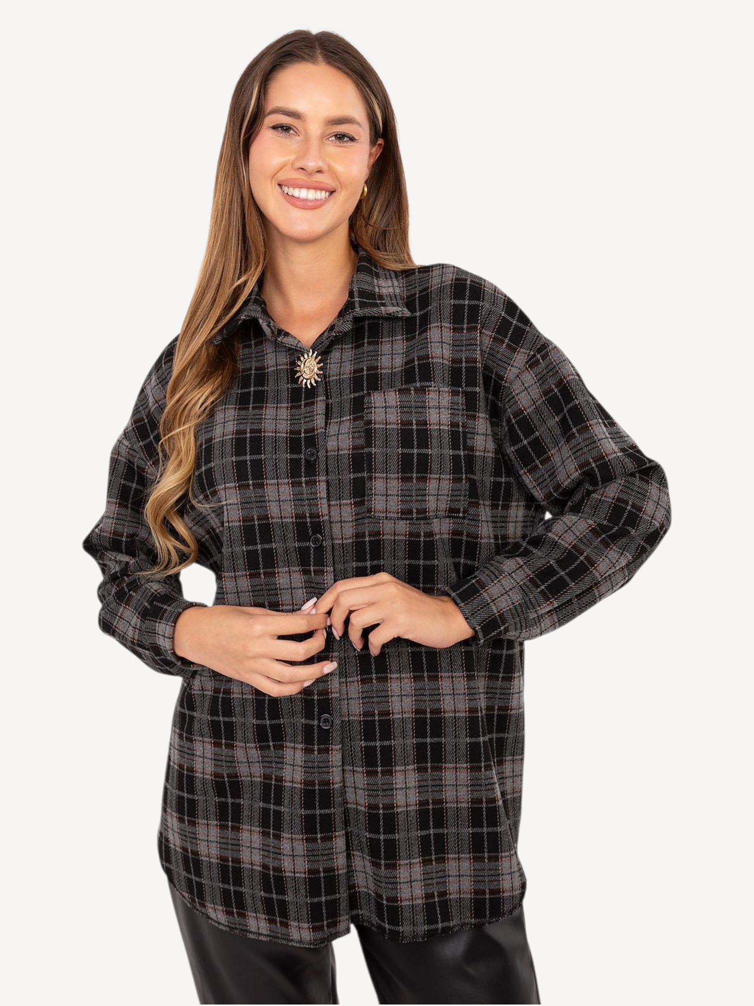Stijlvol flanellen damesoverhemd van een zachte mix van polyester, viscose en elastaan. Met klassieke kraag, knoopsluiting en lange mouwen voor een tijdloze look. Het geruite patroon en de afneembare broche voegen een elegante, modieuze touch toe perfect voor zowel werk als casual dagen.