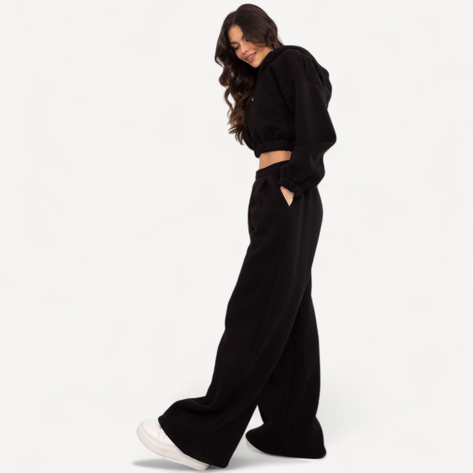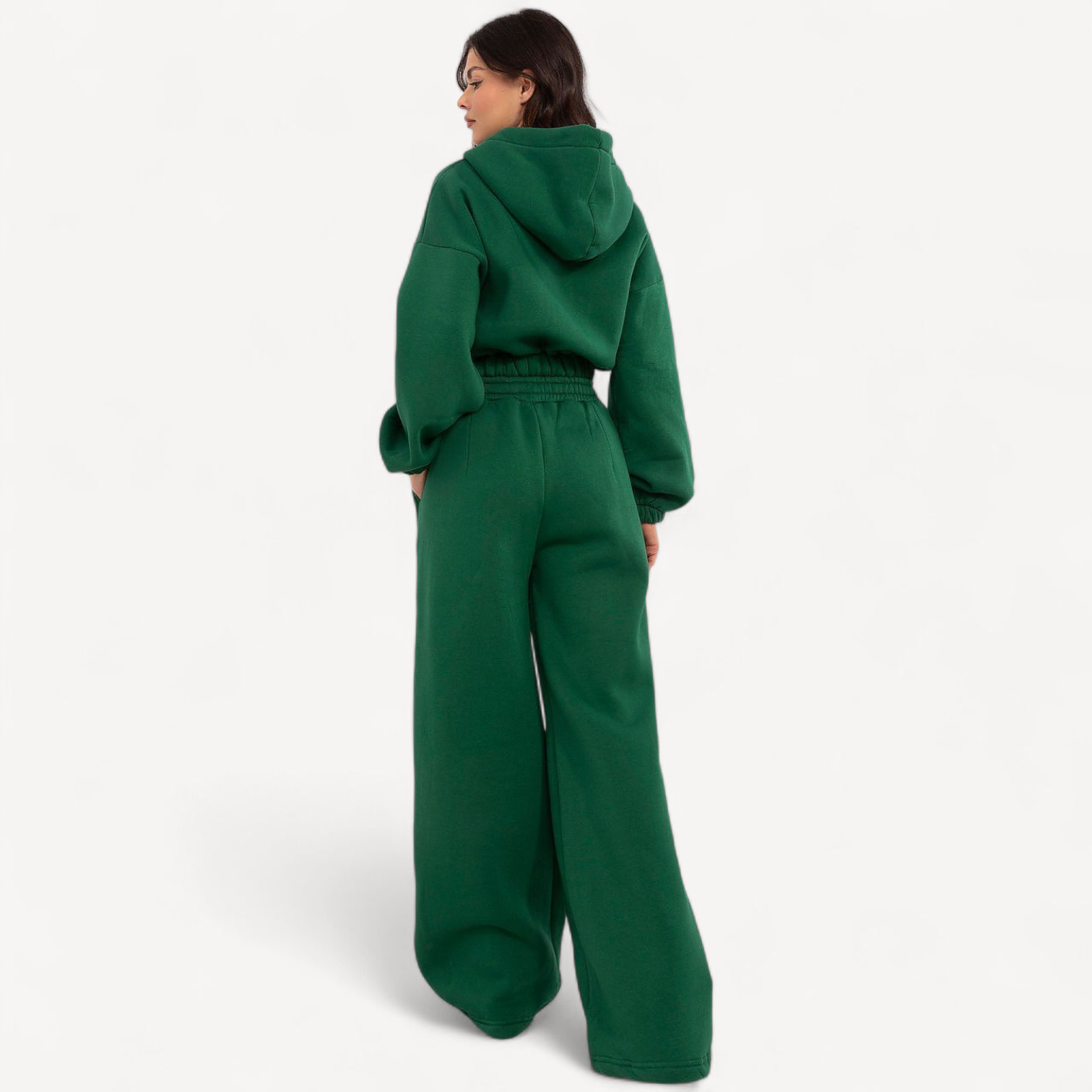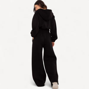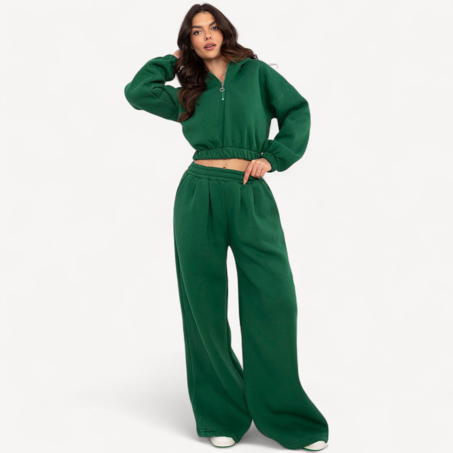 Dit dames trainingspak combineert stijl en draagcomfort. Met capuchontrui met halve rits, broek met hoge taille en wijde pijpen, elastische tailleband en praktische zakken is het perfect voor wandelingen, ontmoetingen met vrienden of ontspannen thuis.