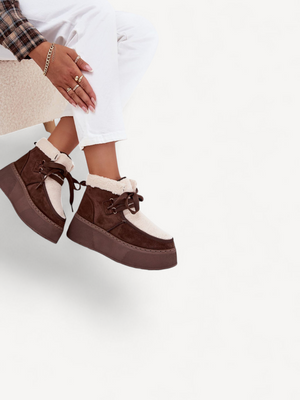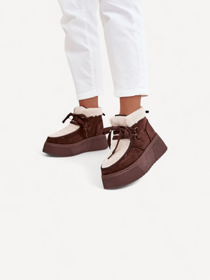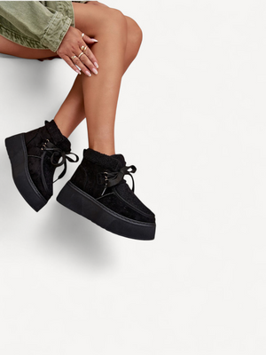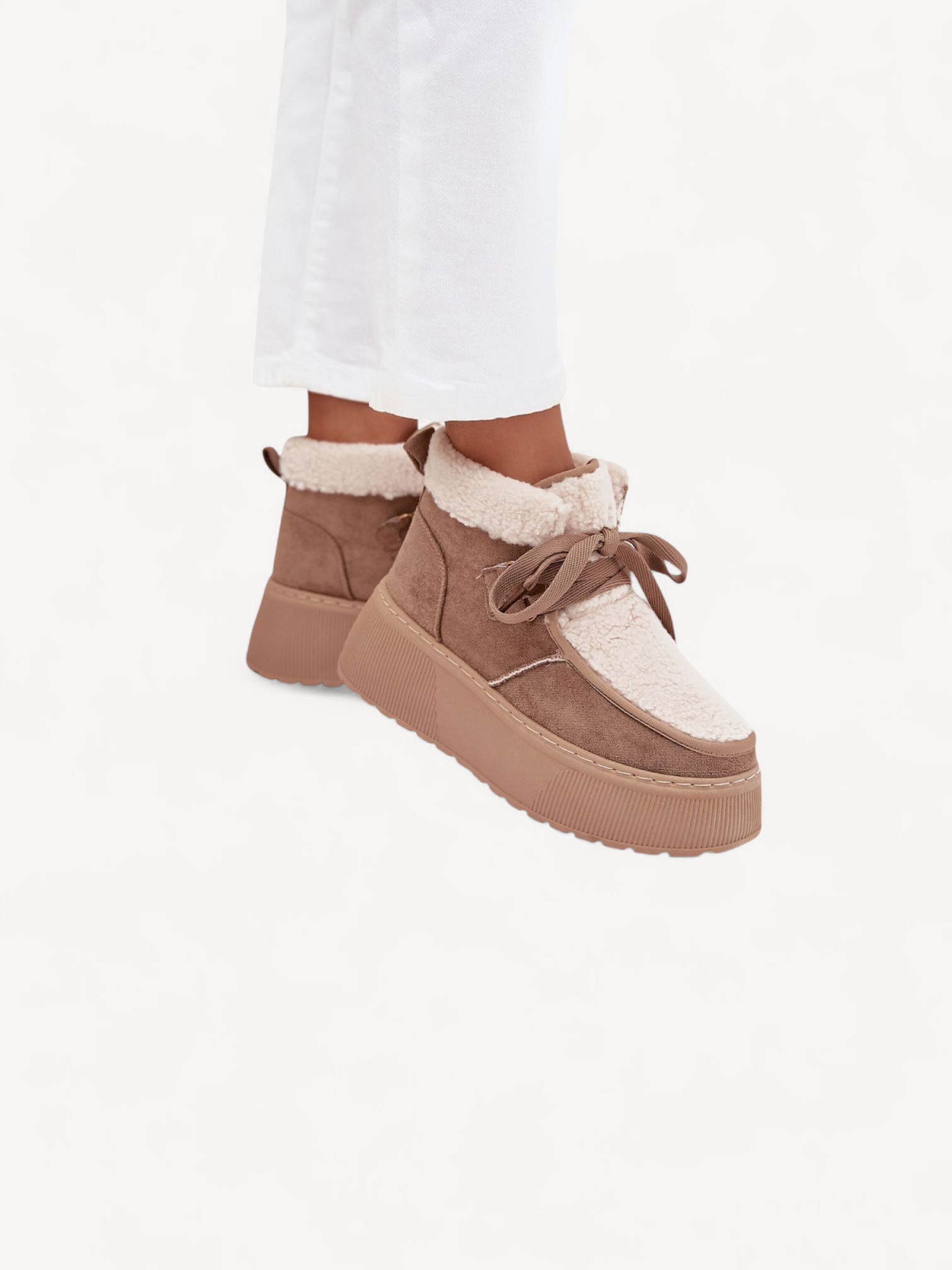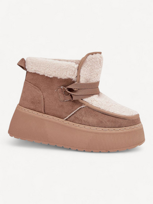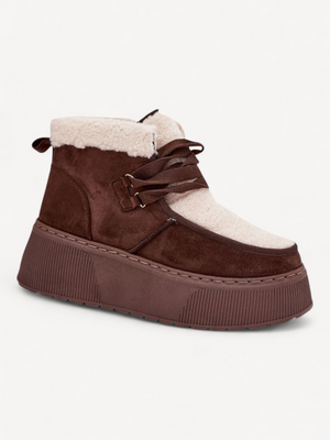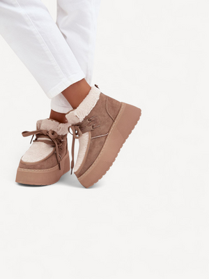 Deze dames snowboots van imitatie suède bieden warmte en comfort dankzij de bontvoering en vetersluiting. Het stevige platform beschermt tegen kou, terwijl het stijlvolle design perfect past bij al je winteroutfits.
