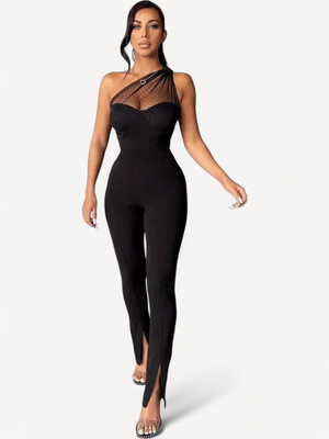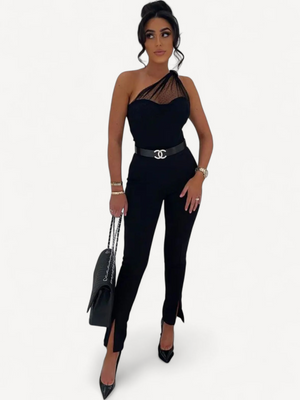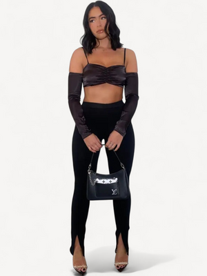 Elegant en speels tegelijk. Deze zwarte broek loopt wijd uit en heeft een stijlvolle split aan de voorkant, voor een flatterende en fashionable look. Perfect om iedere outfit een chique touch te geven.