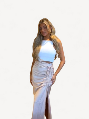 Voel je elegant en vrouwelijk in deze luxueuze zijden rok. Dankzij de verstelbare split bepaal jij zelf hoeveel been je laat zien – perfect voor elke gelegenheid, van chique diner tot zomerse wandeling.