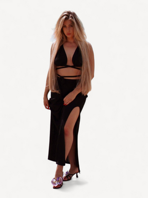 Elegant, stijlvol en vrouwelijk. Deze 2-delige set bestaat uit een top met touwtjes om middel en nek en een lange rok met hoge split, beide gemaakt van zachte wolstof. Perfect voor een chique, comfortabele en opvallende look.